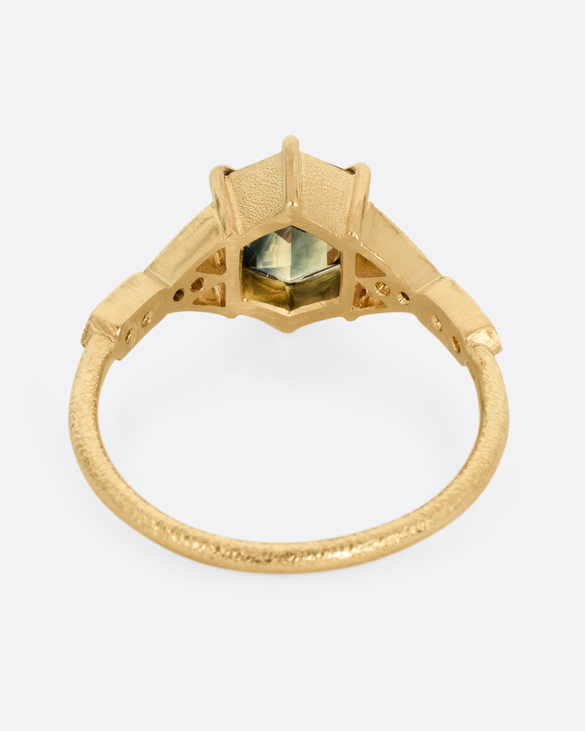 Brilliant diamonds and delicate cutouts accompany this deep green Australian sapphire. Prong set for maximum light refraction, this standalone piece flashes and sparkles from every angle.