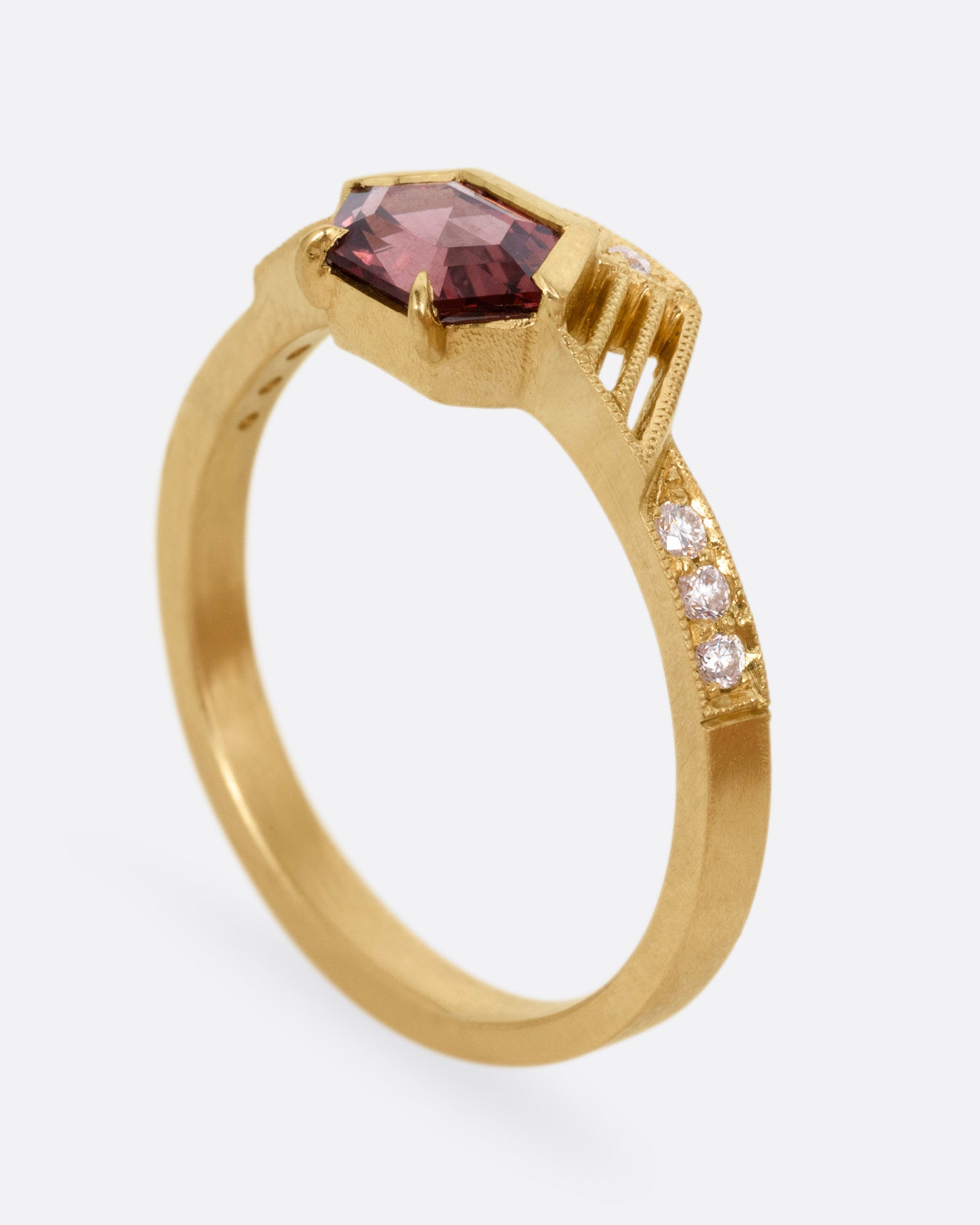Diamond accents and linear cutouts accompany this vivid red spinel as it hovers beneath an angular arch. Prong set for peak light refraction, this effortless stacker sparkles from every angle.
