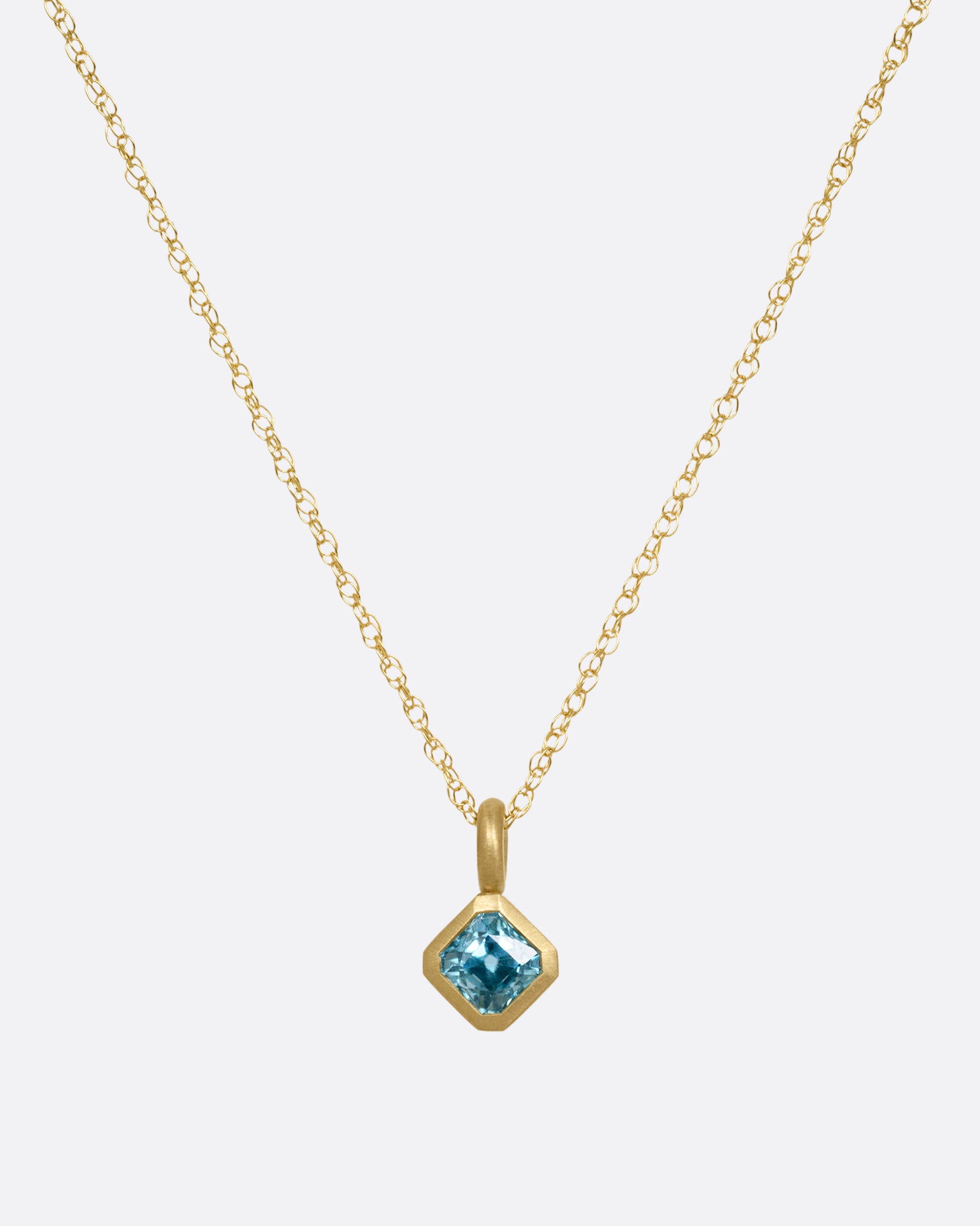 The blue green hue of this blue zircon brings to mind visions of tropical shores. The satin finish of its heavy bail makes the color standout even more.