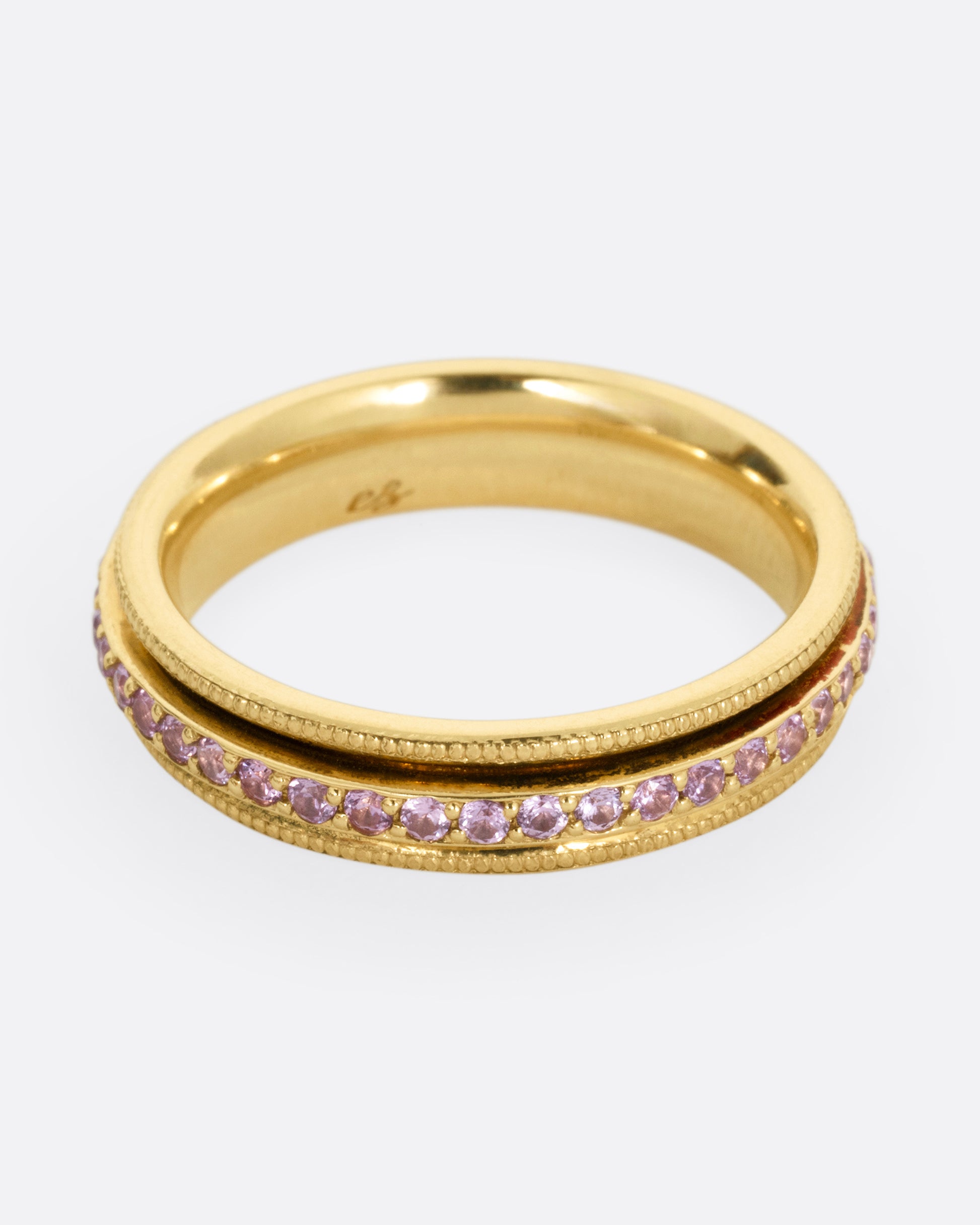 A halo of pale pink sapphires freely rotates around this eternity band. Throw sparkle from your stack with every turn of this spinner.
