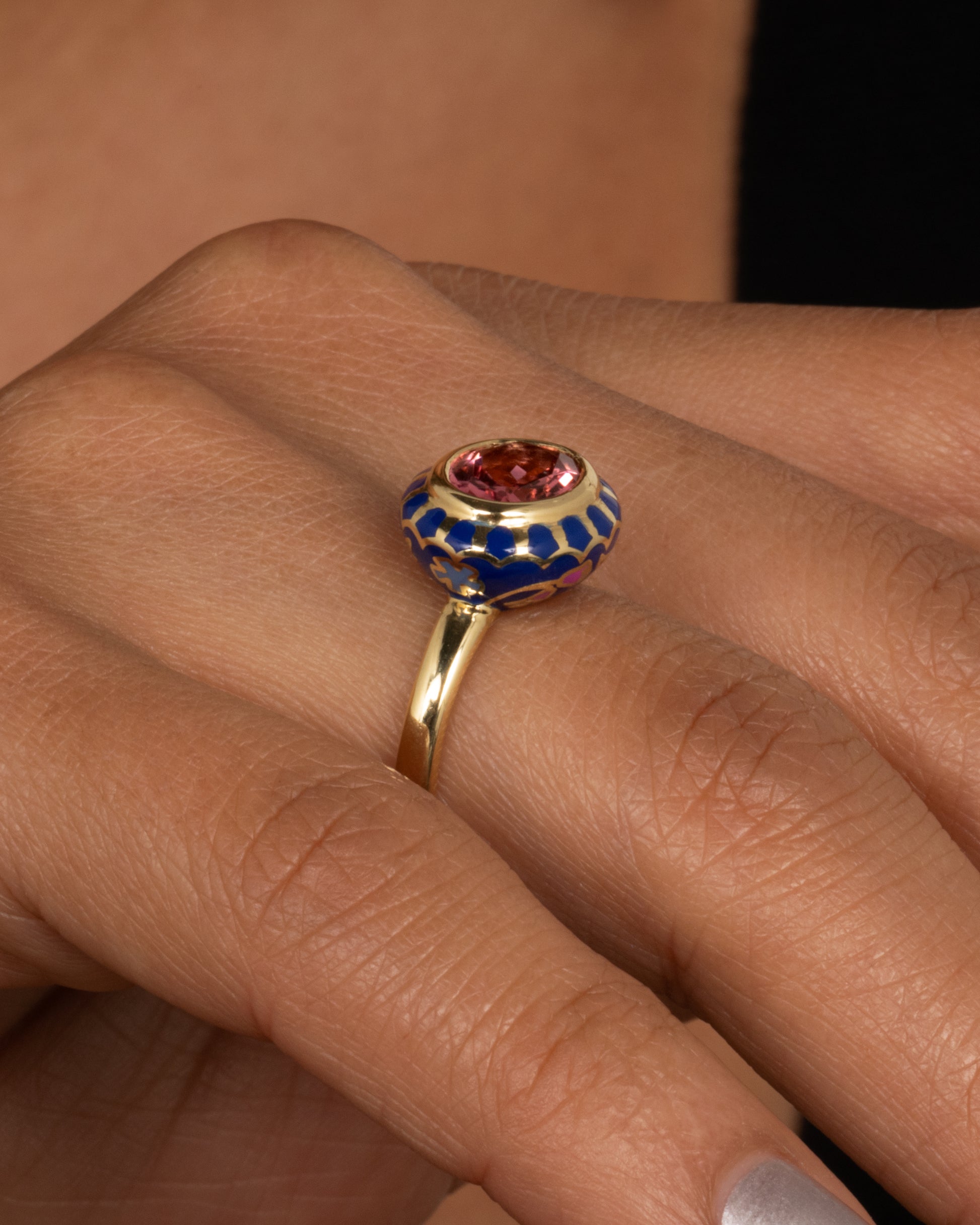 An oval cut pink tourmaline radiates in a bezel setting at the center of a deep blue floral enamel wreath. A vivid statement piece.