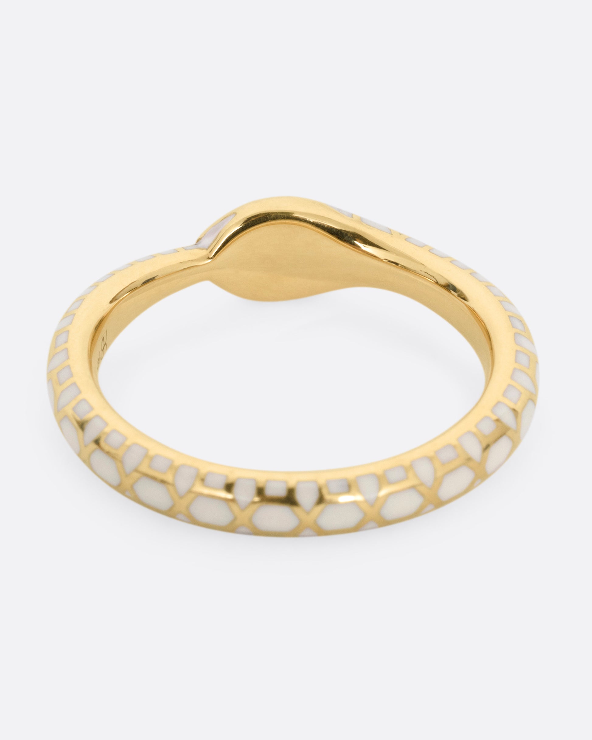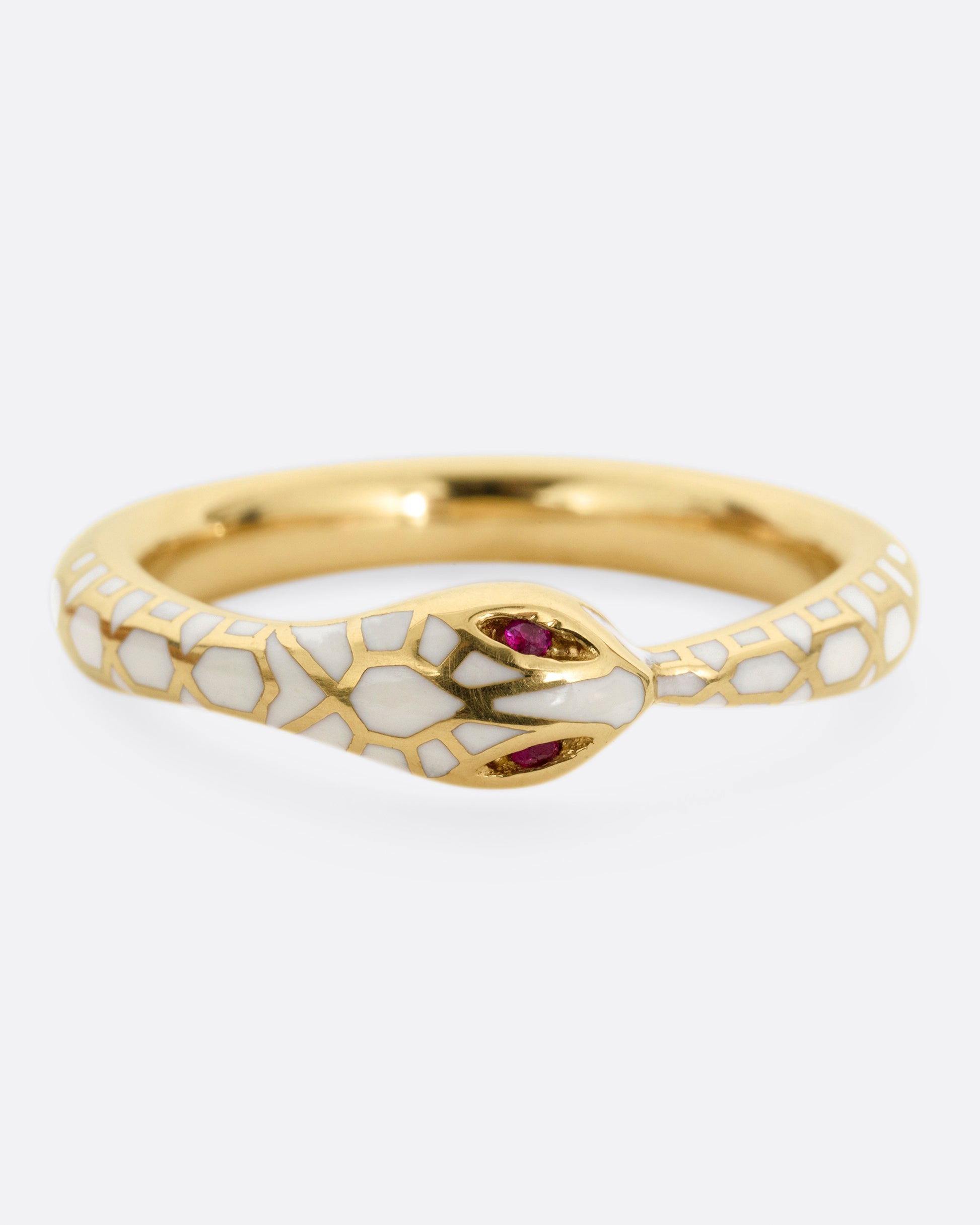This emerald eyed ouroboros winds its way around your finger in cream enamel. The ouroboros, an ancient symbol of a serpent eating its own tail, represents the cycle of life, death, and rebirth. Wear this serpent for constant strength and courage.