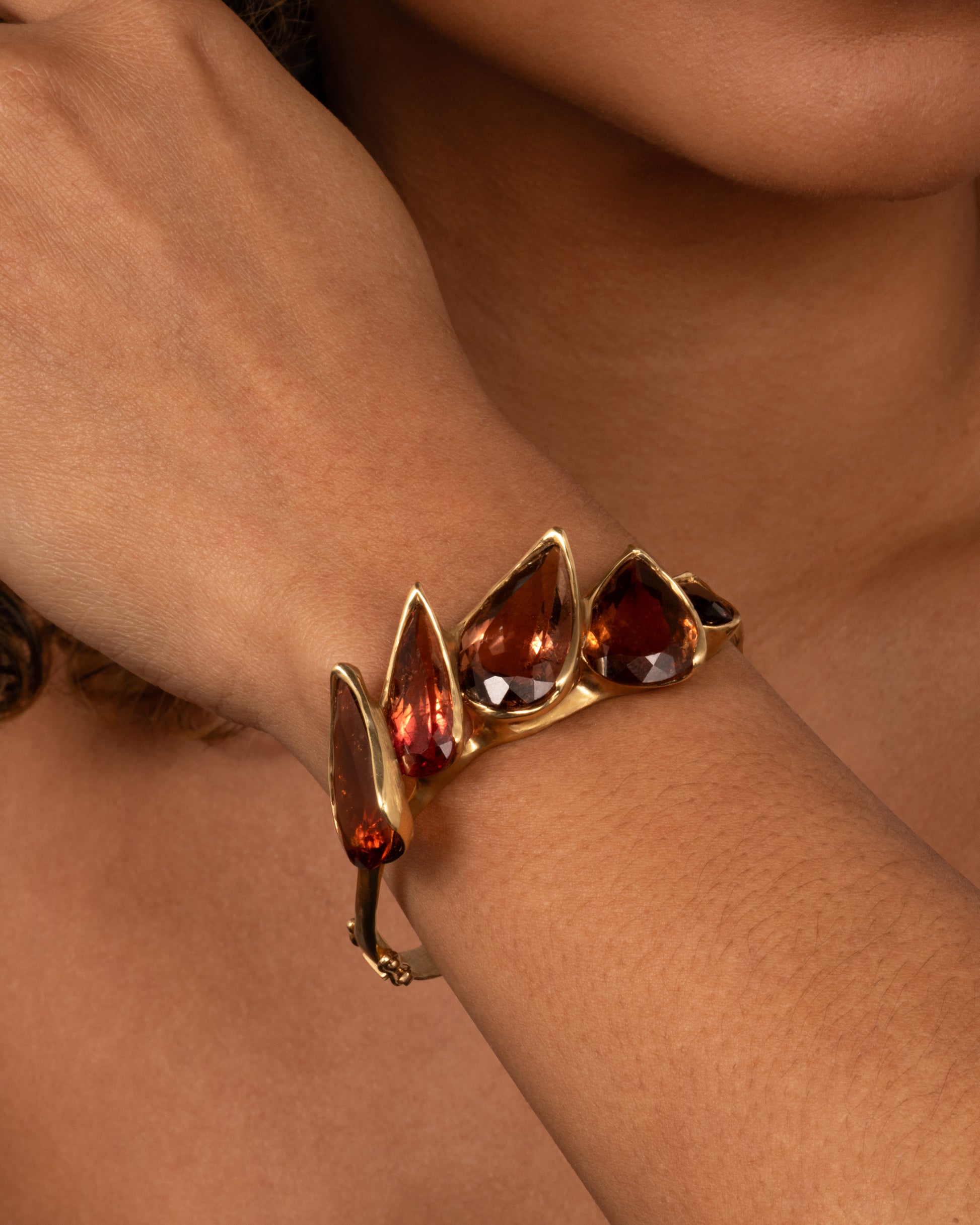 Add a touch of heat to your wrist with this smoldering tourmaline cascade bracelet. A hinged back and sturdy clasp allow for reliable wear, day or night.