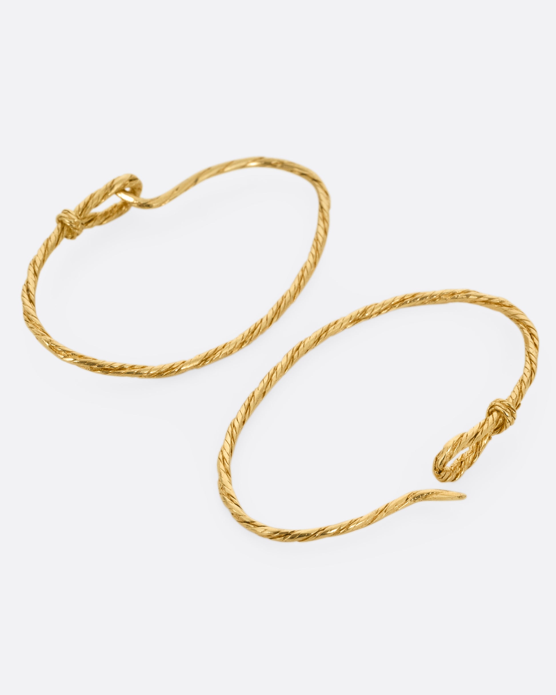 Classic hoops... with a twist. This pair features a winding texture, oval shape, and eye and hook closures; a playful departure from traditional gold hoops.