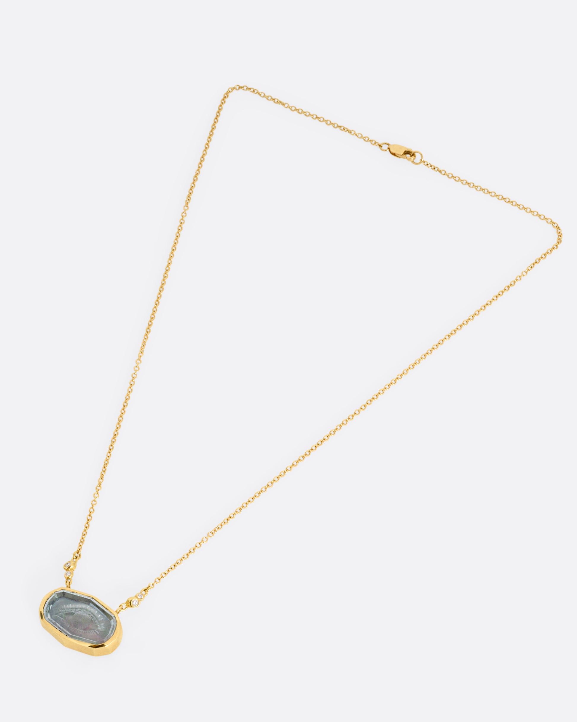 Created by beloved designer Kimberlin Brown, this piece is part of our 'Hand of the Artist' capsule collection. An expressive eye intaglio gazes from a bezel set clear quartz, cleverly set with a slice of abalone behind, creating an ever changing iridescent glow. Kimberlin's signature diamond anemones create droplets of sparkle along the fine cable chain.