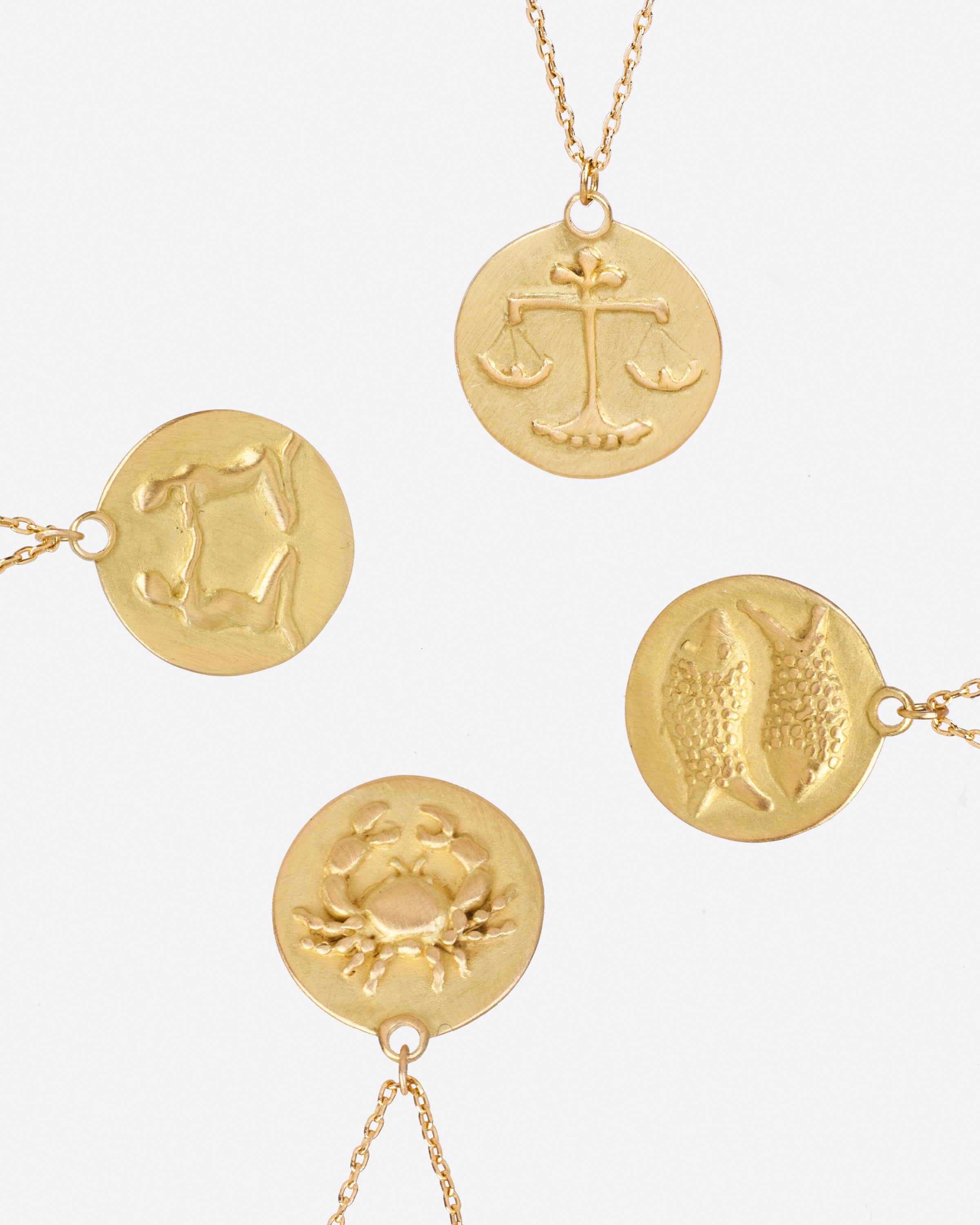 Each of these disc pendants features a hand carved and cast astrological symbol. With an ancient style design, these medallions are timeless and classic.
