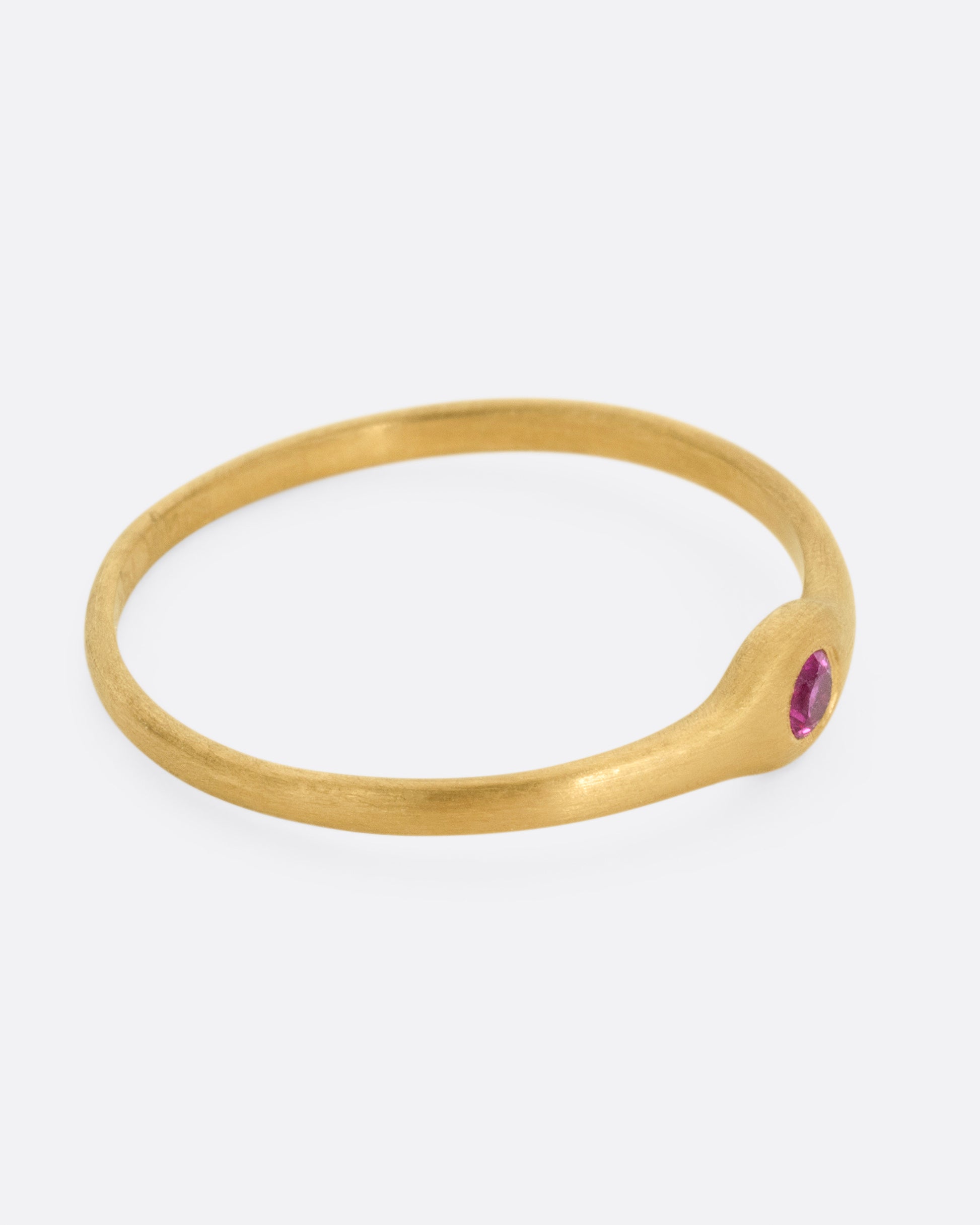 A fiery ruby smolders from the face of this sleek velvety gold band. An easy stacker or solo pop of color.
