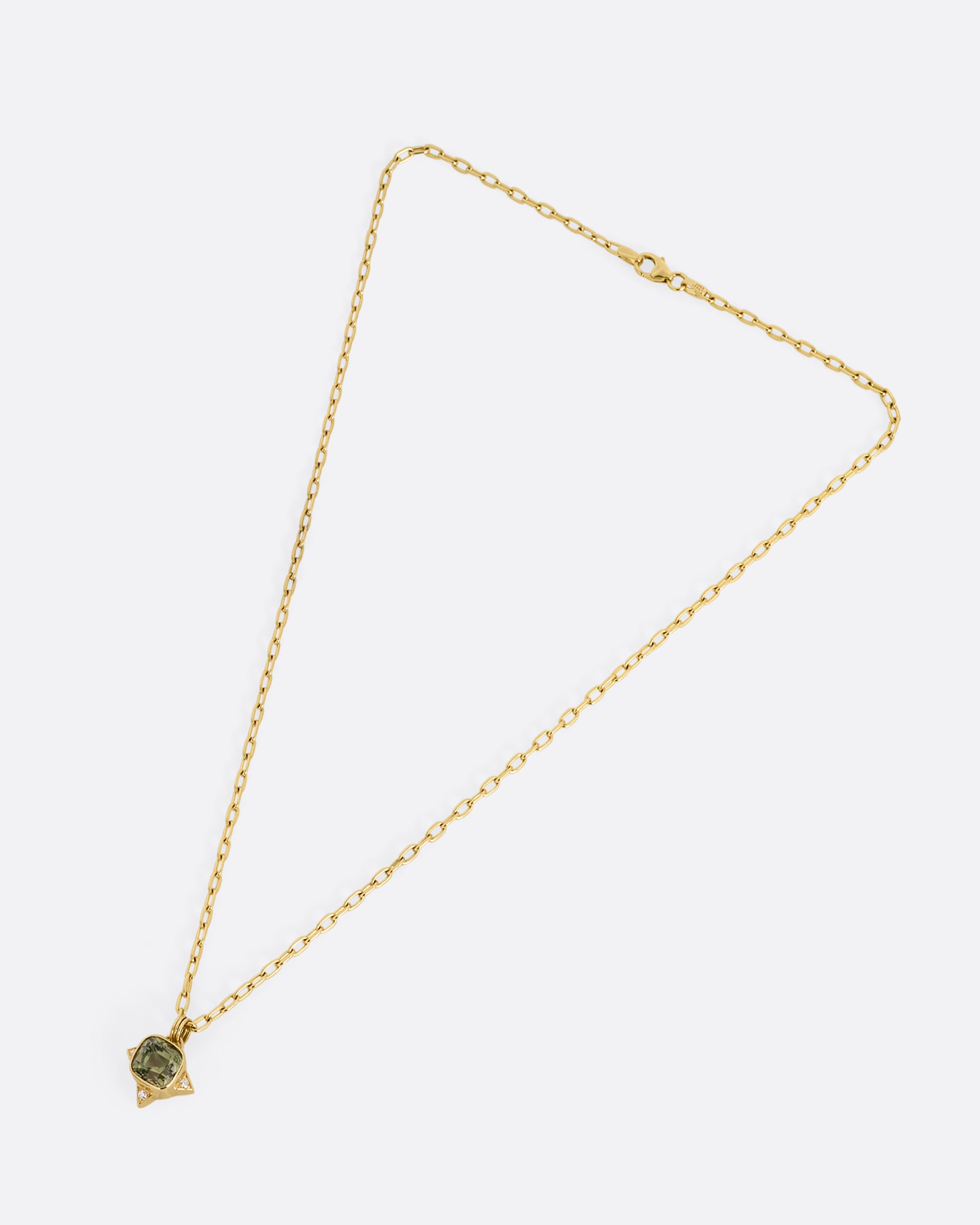 A lush green tourmaline glows from its setting among diamond studded points. Add a sharp bit of color and sparkle to your neckline with this substantial cable chain.