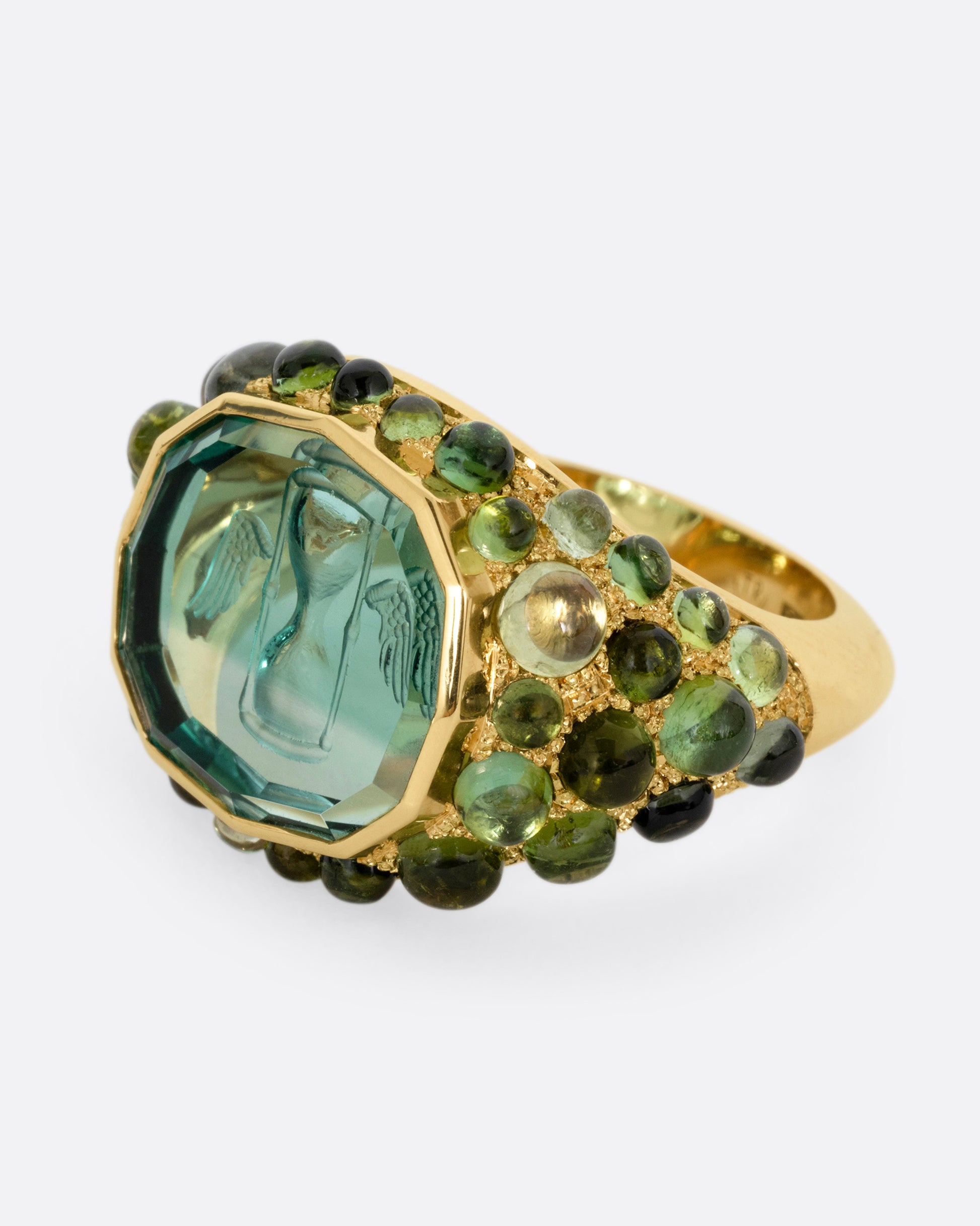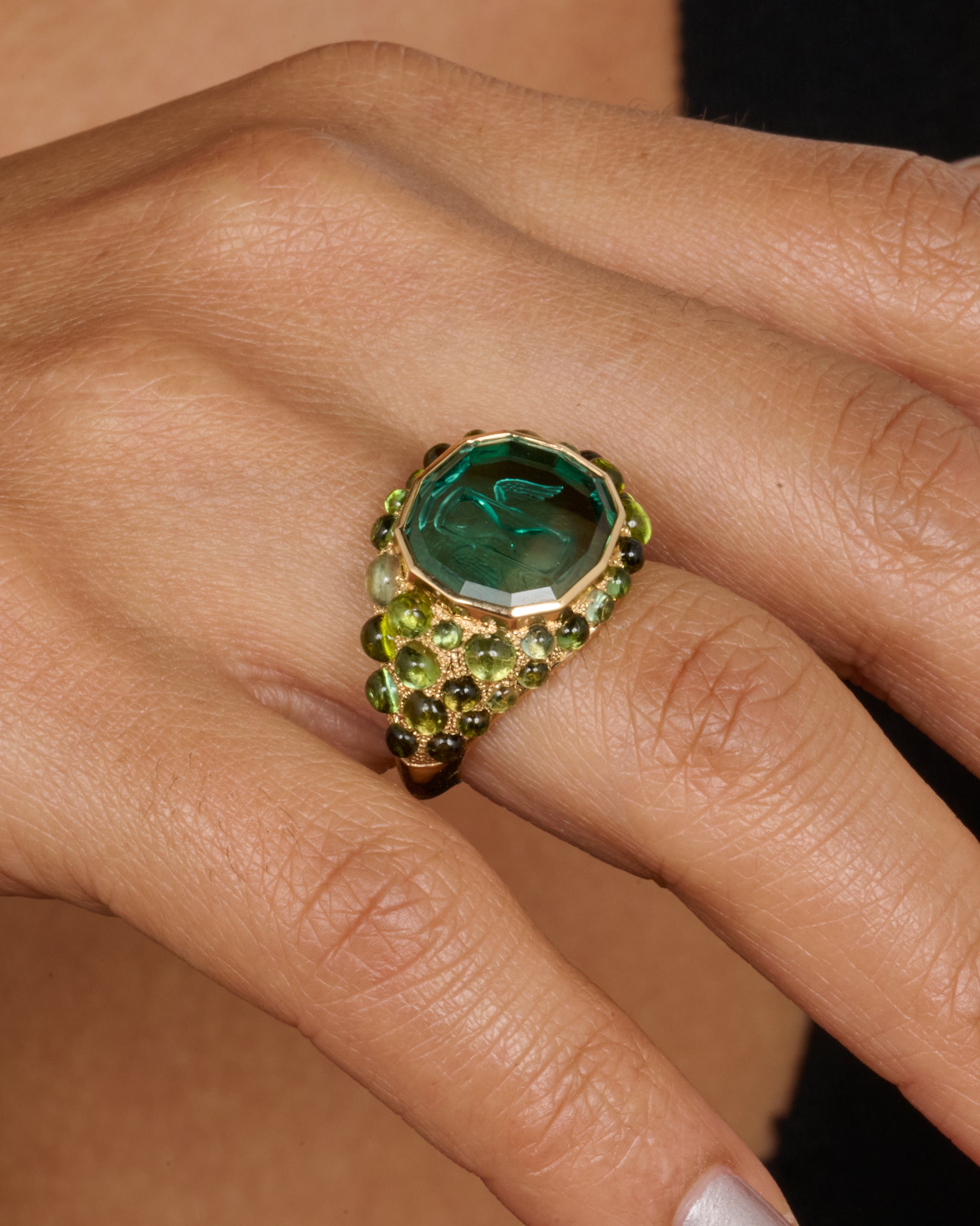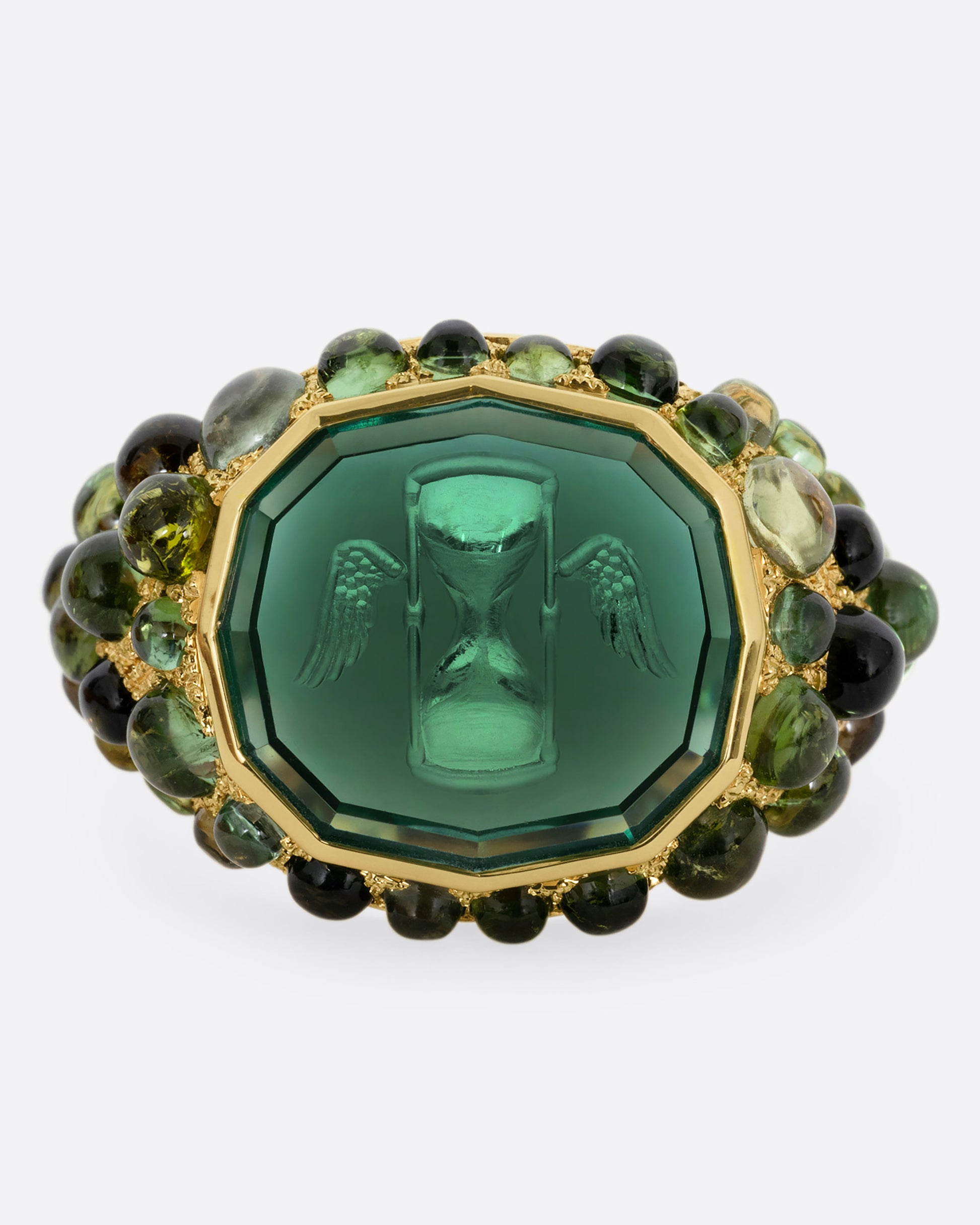 Nestled in this dimensional signet band, a hand carved winged hourglass hovers in green tourmaline. This weighty statement band is freckled in lush tourmaline and sapphire cabochons, creating eye-catching dimension. A beautiful reminder that time really does fly.