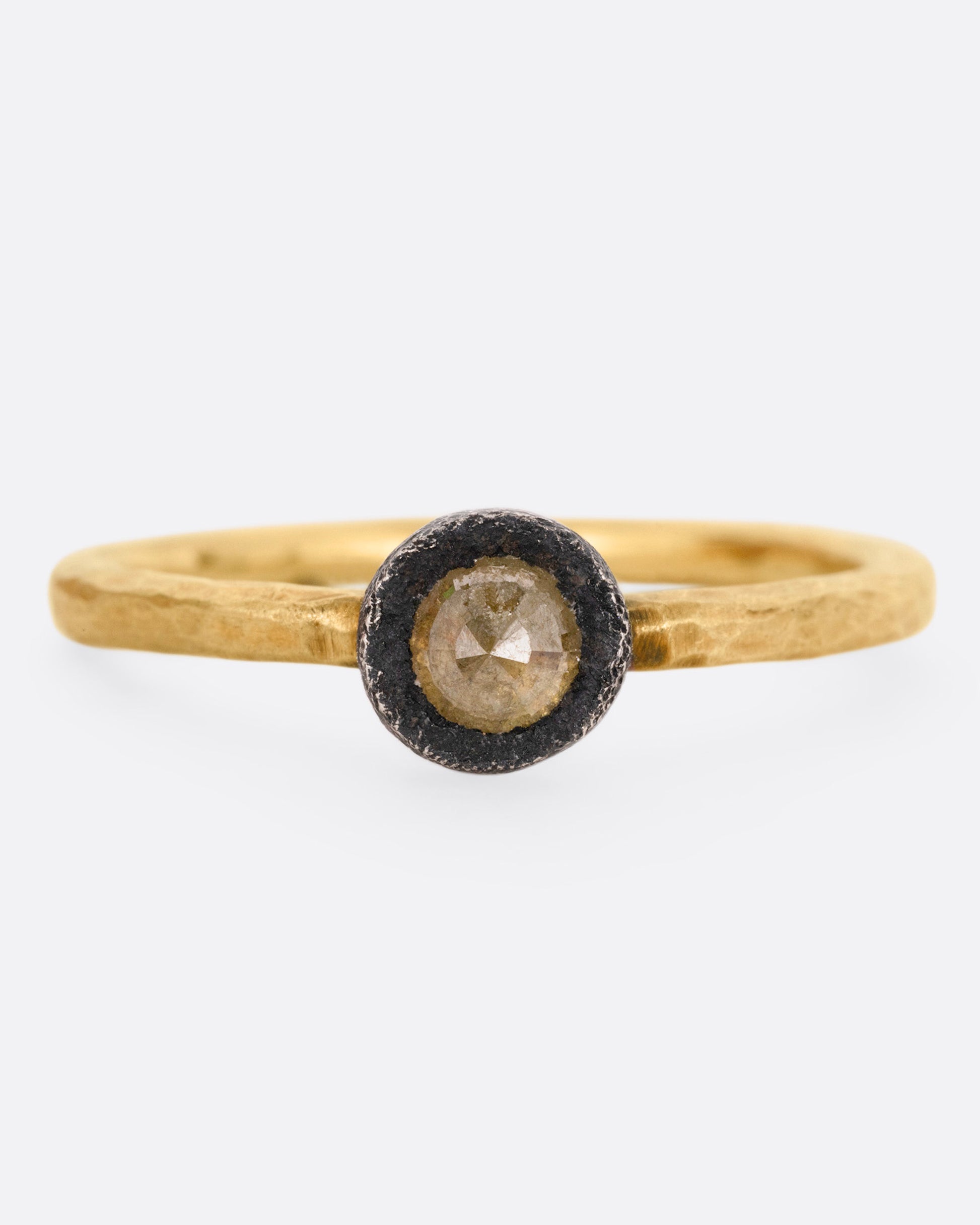 A darkened sterling bezel provides a night sky for the glow of this yellow diamond, while directly contrasting the hammered yellow gold band. With a narrow silhouette and minimalist silhouette, this piece is an effortless stacker.