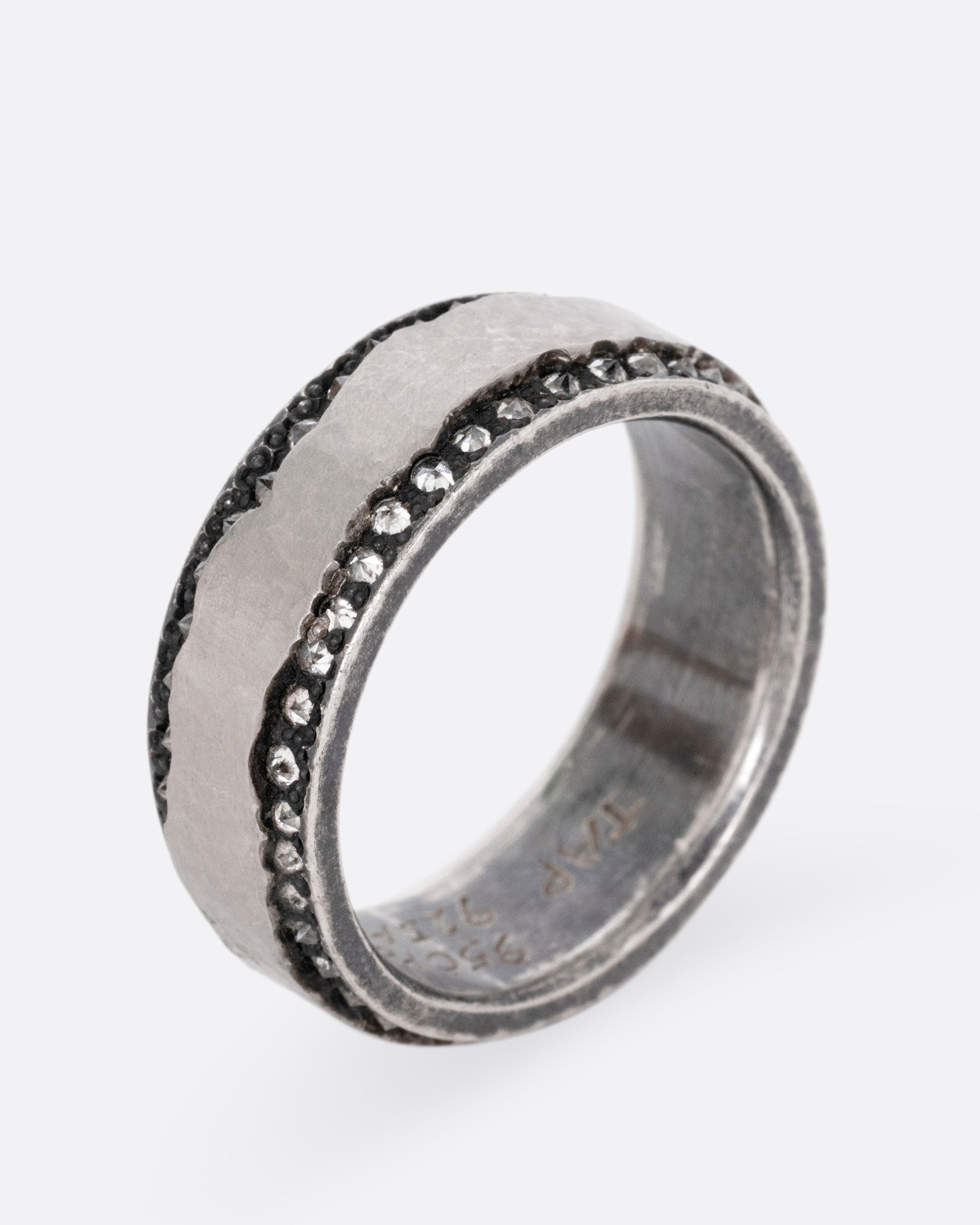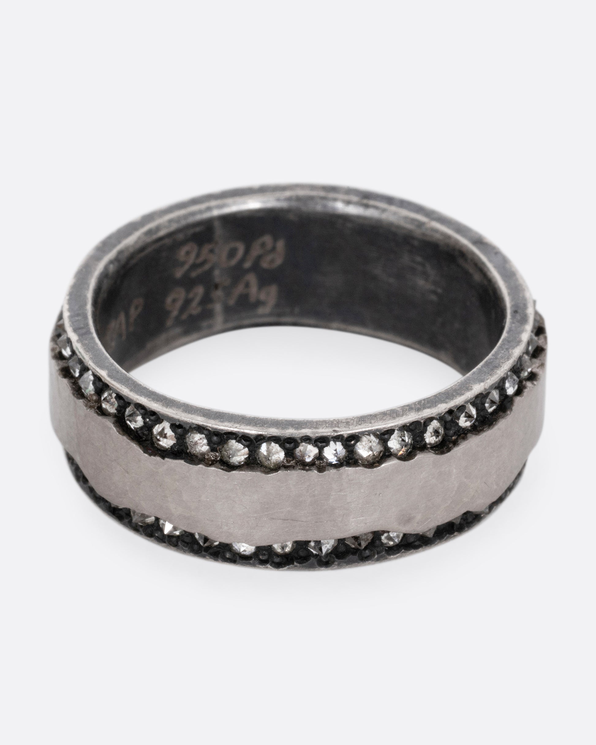 A ribbon of platinum wraps around the center of this darkened silver band, adding a heavy durability and that telltale platinum luster. Inverted diamonds halo each edge, creating a hint of unexpected sparkle.