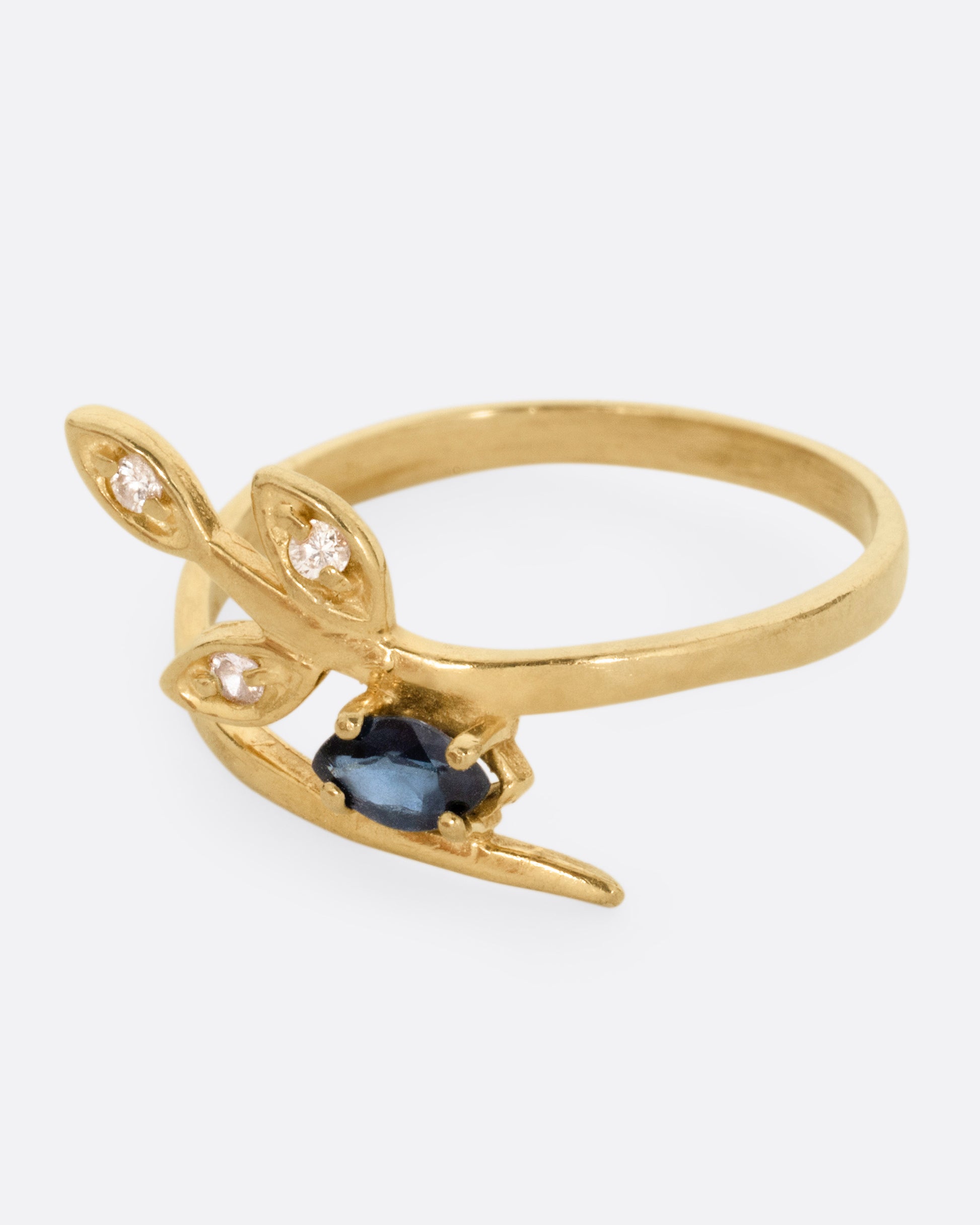 This diamond studded branch wraps around your finger, as it offers up a deep blue marquise sapphire.