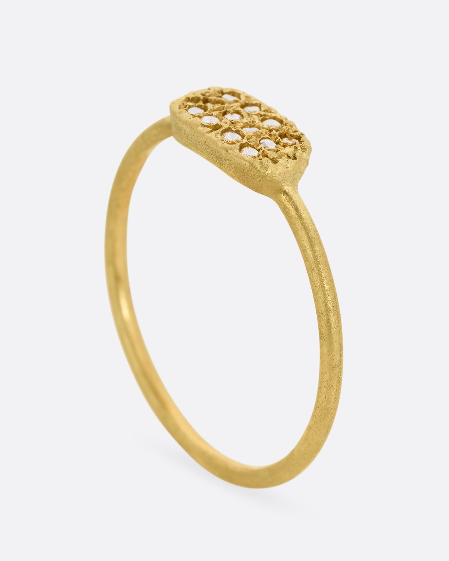 Twelve tiny white diamonds pepper the face of this delicately textured ring. An addition of sparkle and depth to your set up.