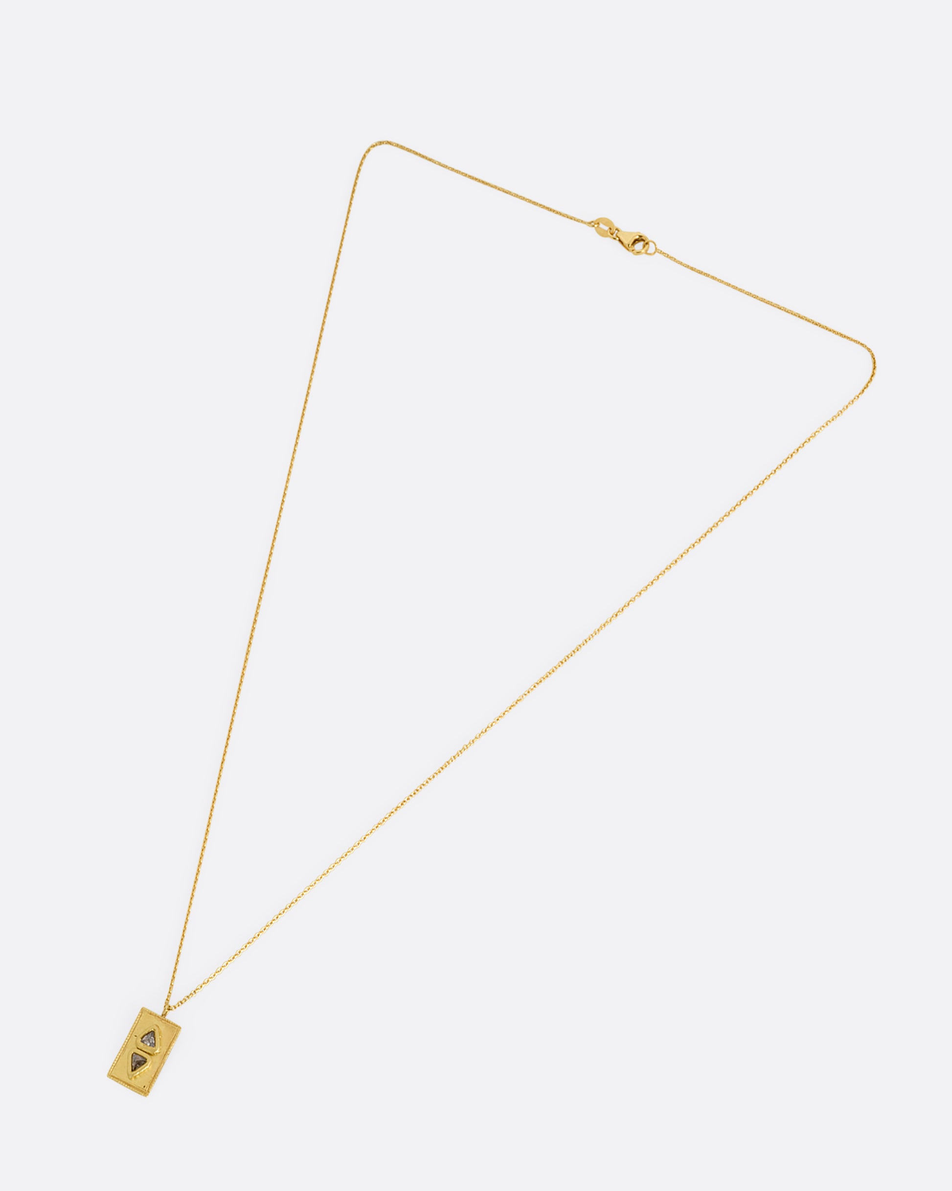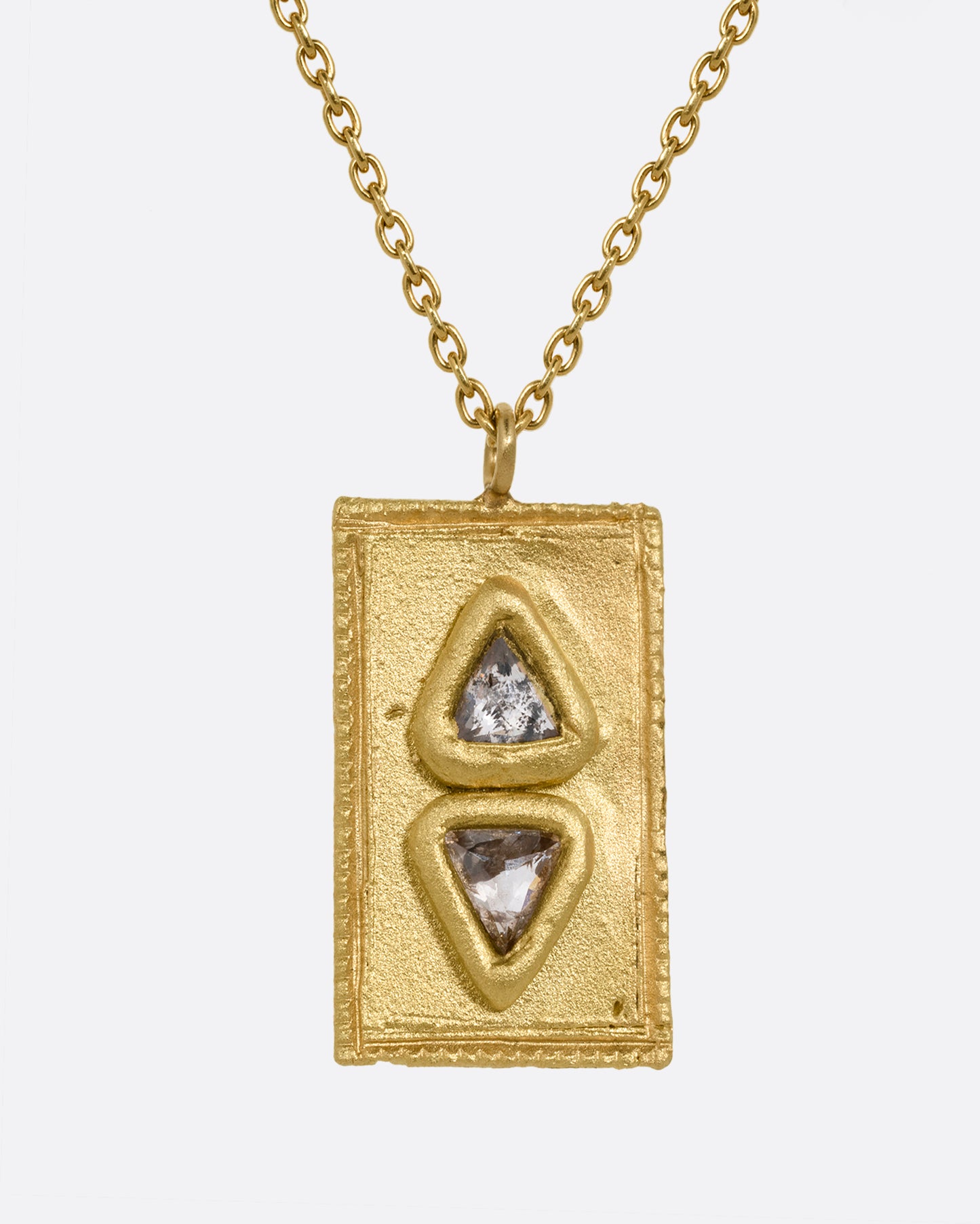 Salt and pepper diamonds mirror each other on this rectangular pendant. A bit of sparkle for your neckline.