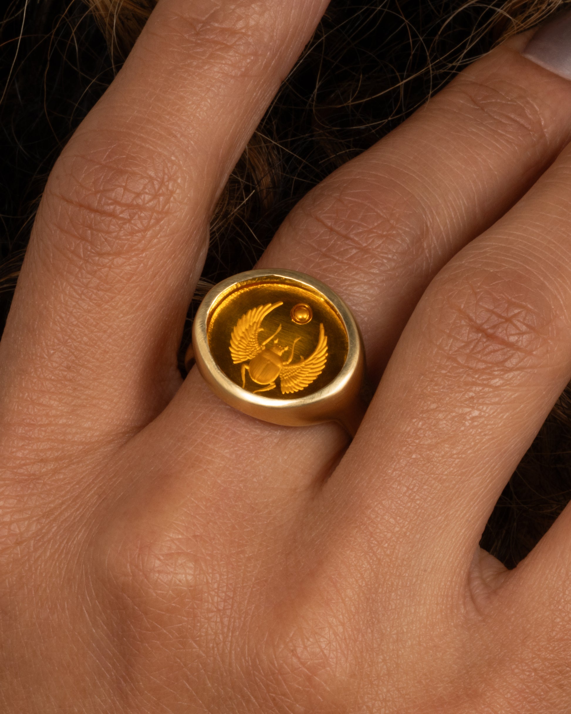 As light passes over this warm citrine, the precision in its intricate hand carved scarab is illuminated from within. A sleek, fluid setting creates a seamless look between the citrine and its gold cradle - as if entirely one piece. Handmade by designer Diana Mitchell in her Brooklyn studio, this weighty signet is part of our 'Hand of the Artist' capsule collection. A significant symbol in ancient Egypt, the scarab represents the sun god Khepri and the daily cycle of the sun, life, and rebirth.