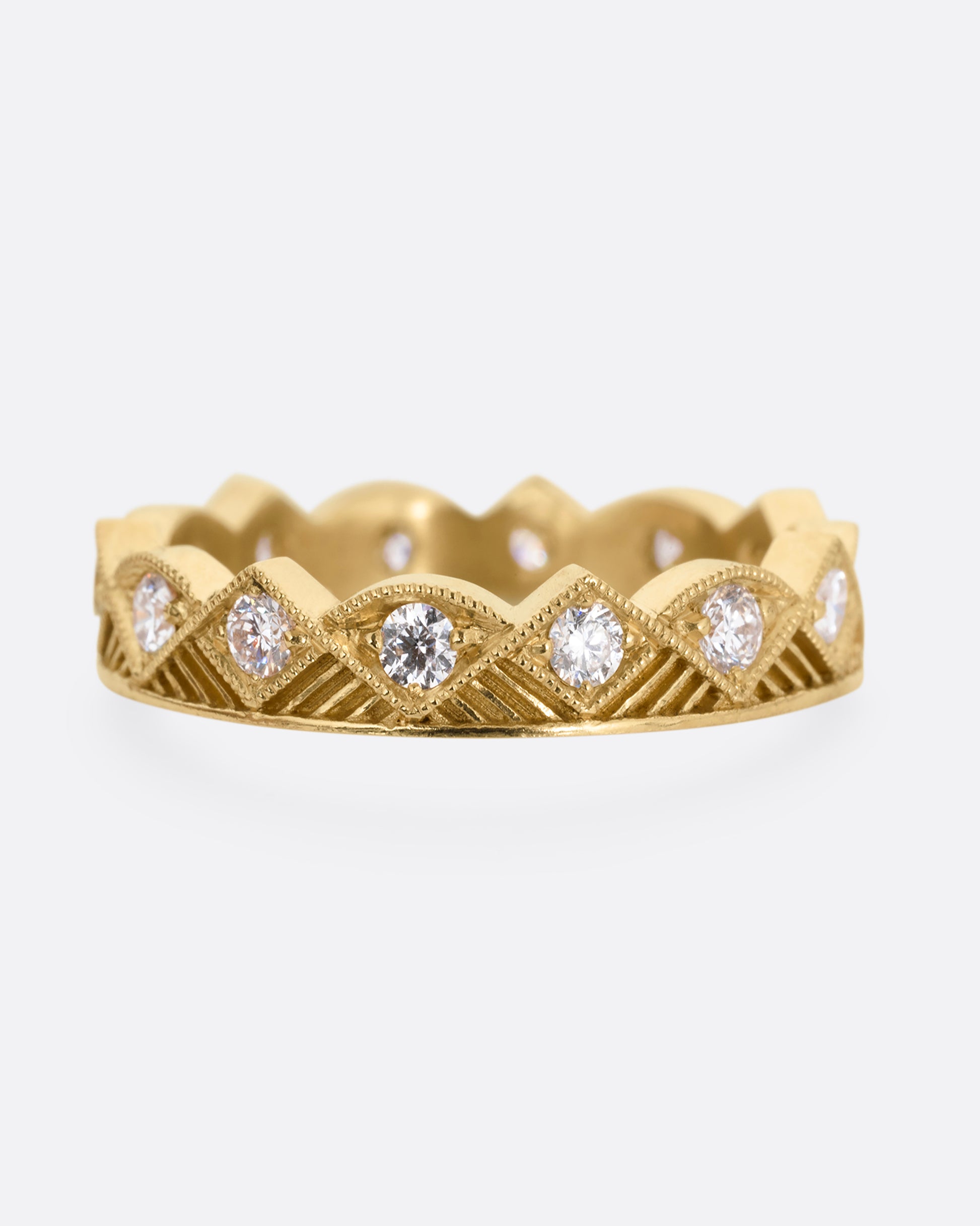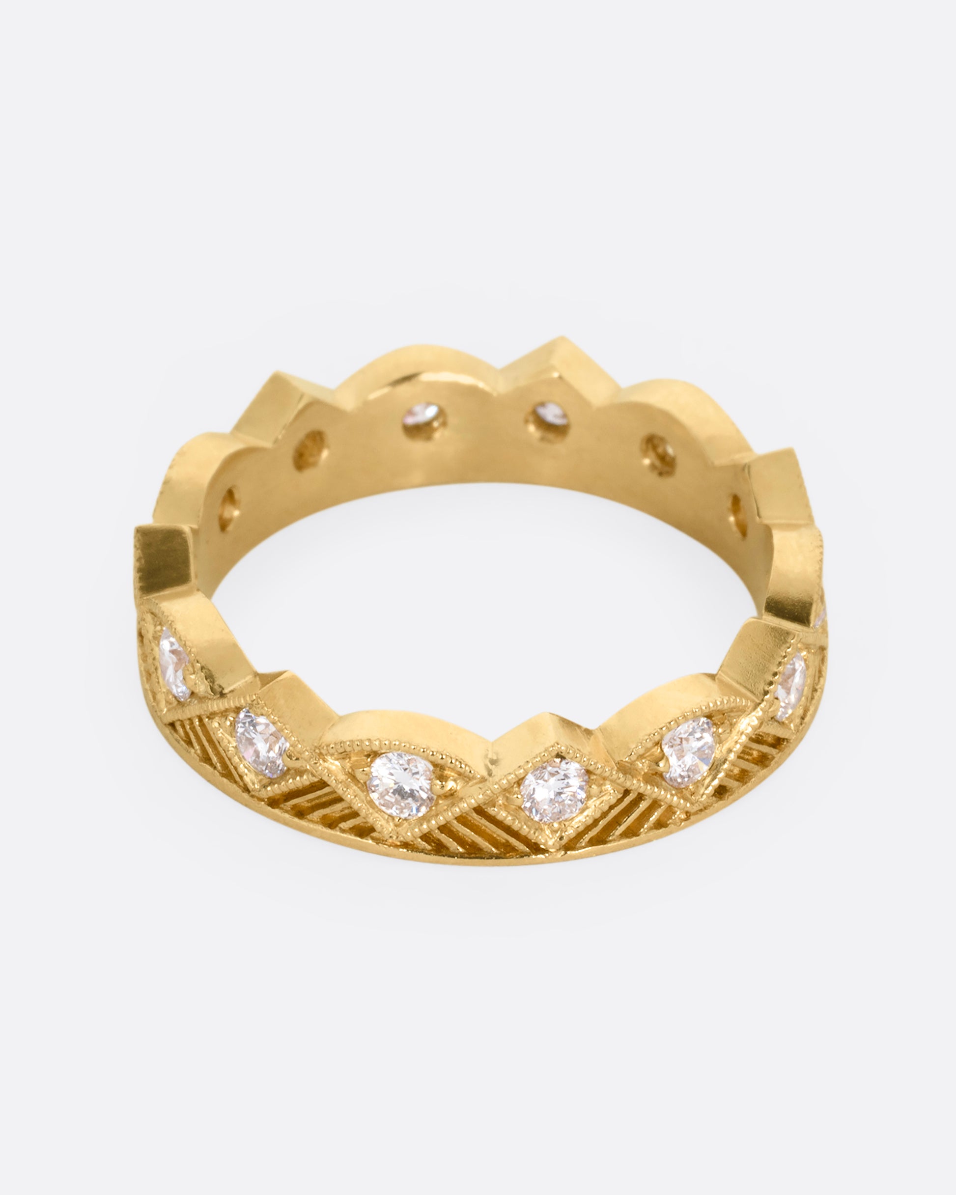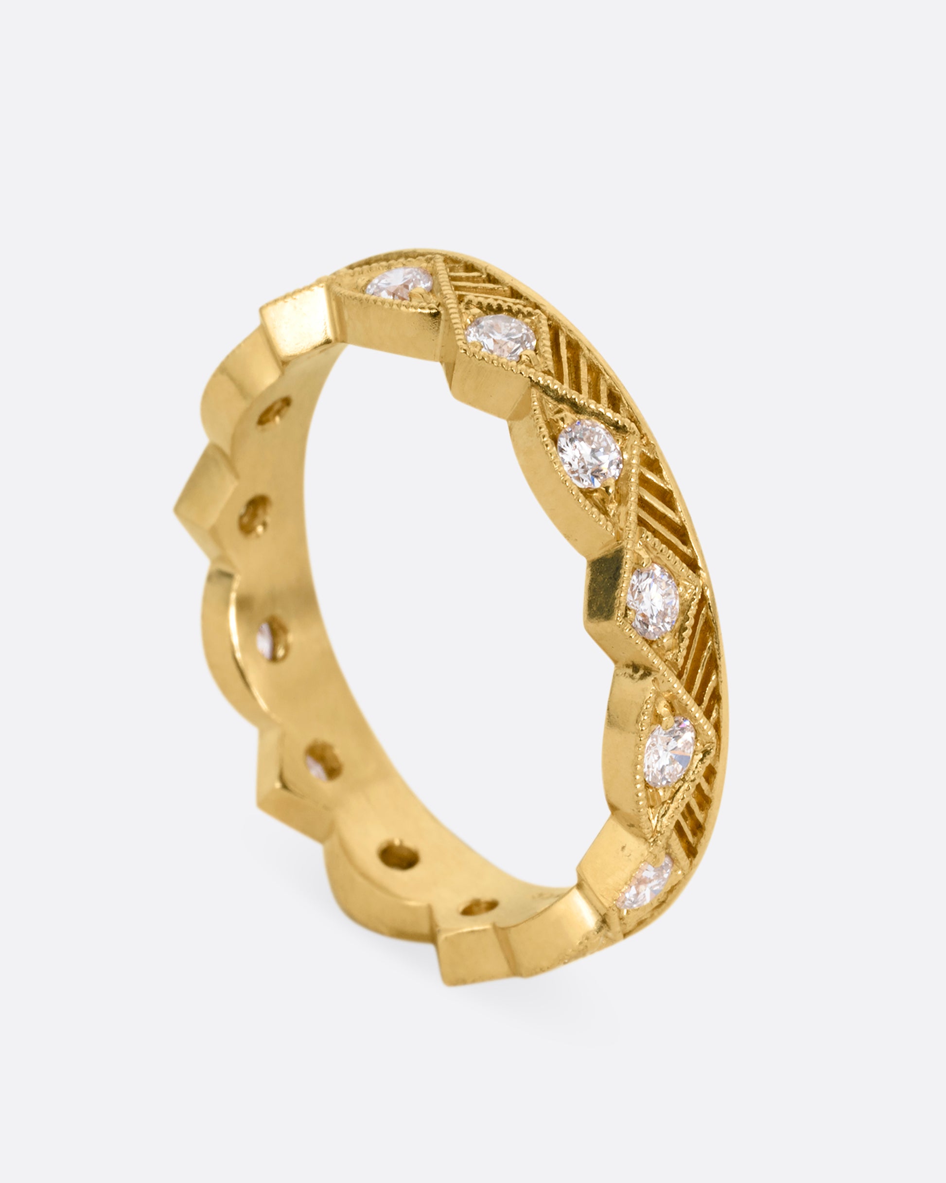 This finely detailed eternity band has a geometric landscape of alternating peaks and valleys. Bead set diamonds sparkle from every point and arc. A stunning stacker.