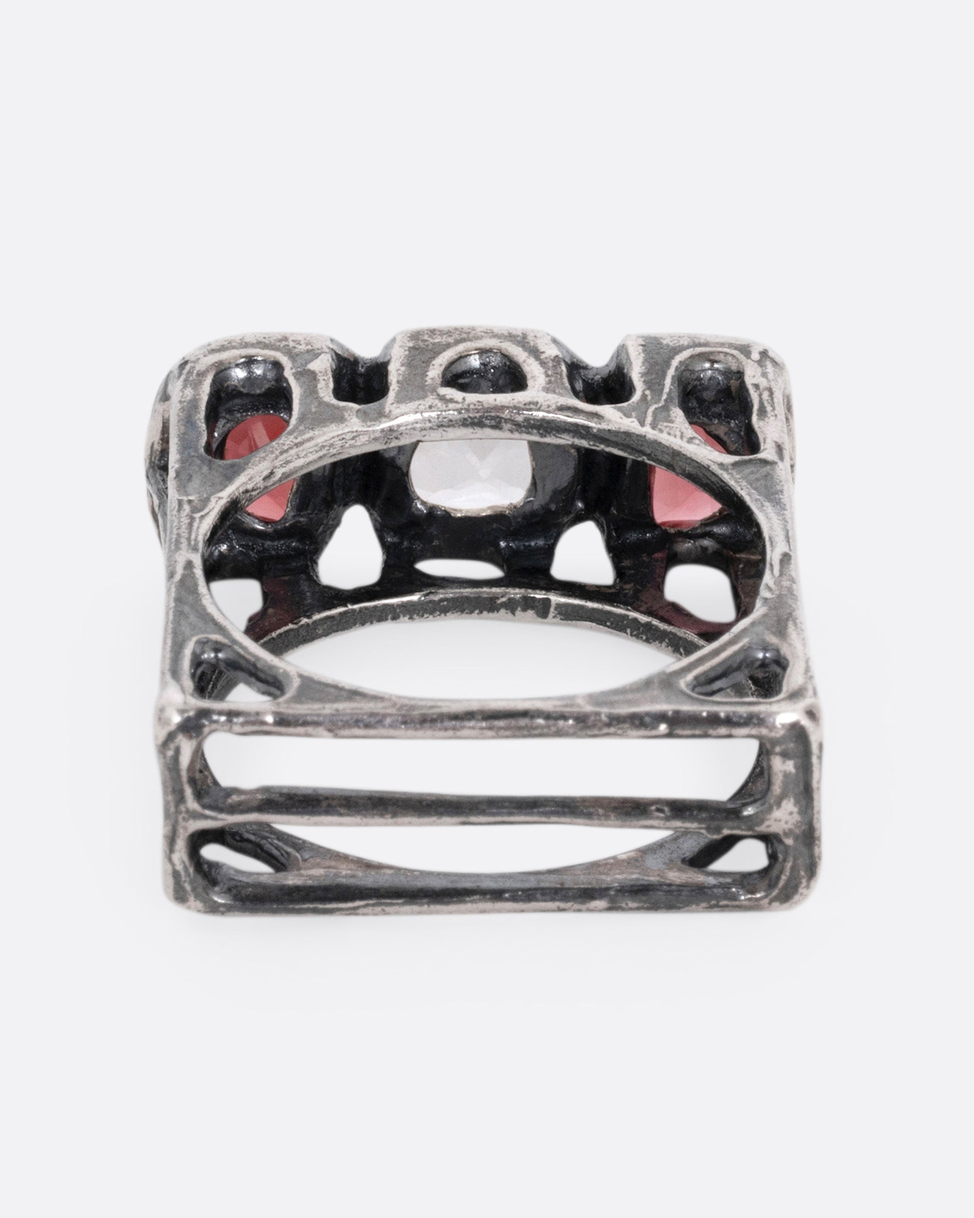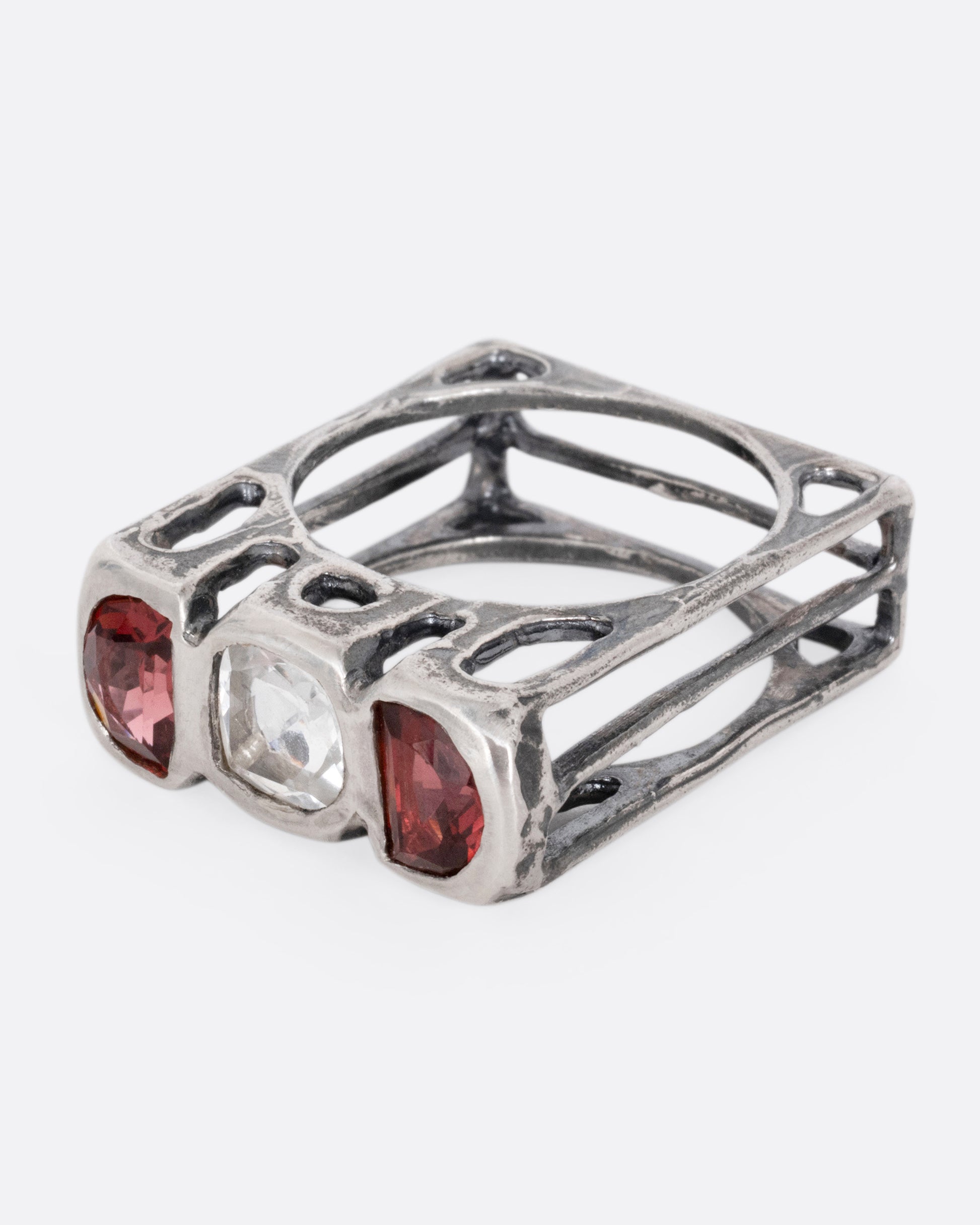 As if stepping out from behind two deep red curtains, a cushion cut white topaz gleams between two half moon garnets. An ideal solo wear.