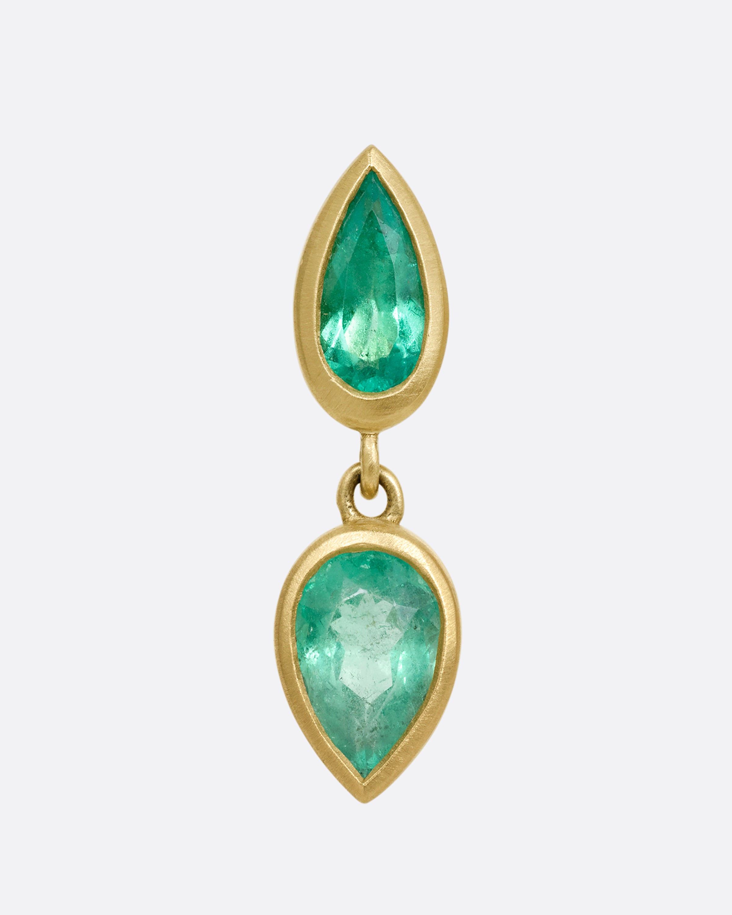 An eye-catching addition of movement and color, this drop earring features two glowing bezel set emeralds and a matte finish that enhances the rich hue of the stones.