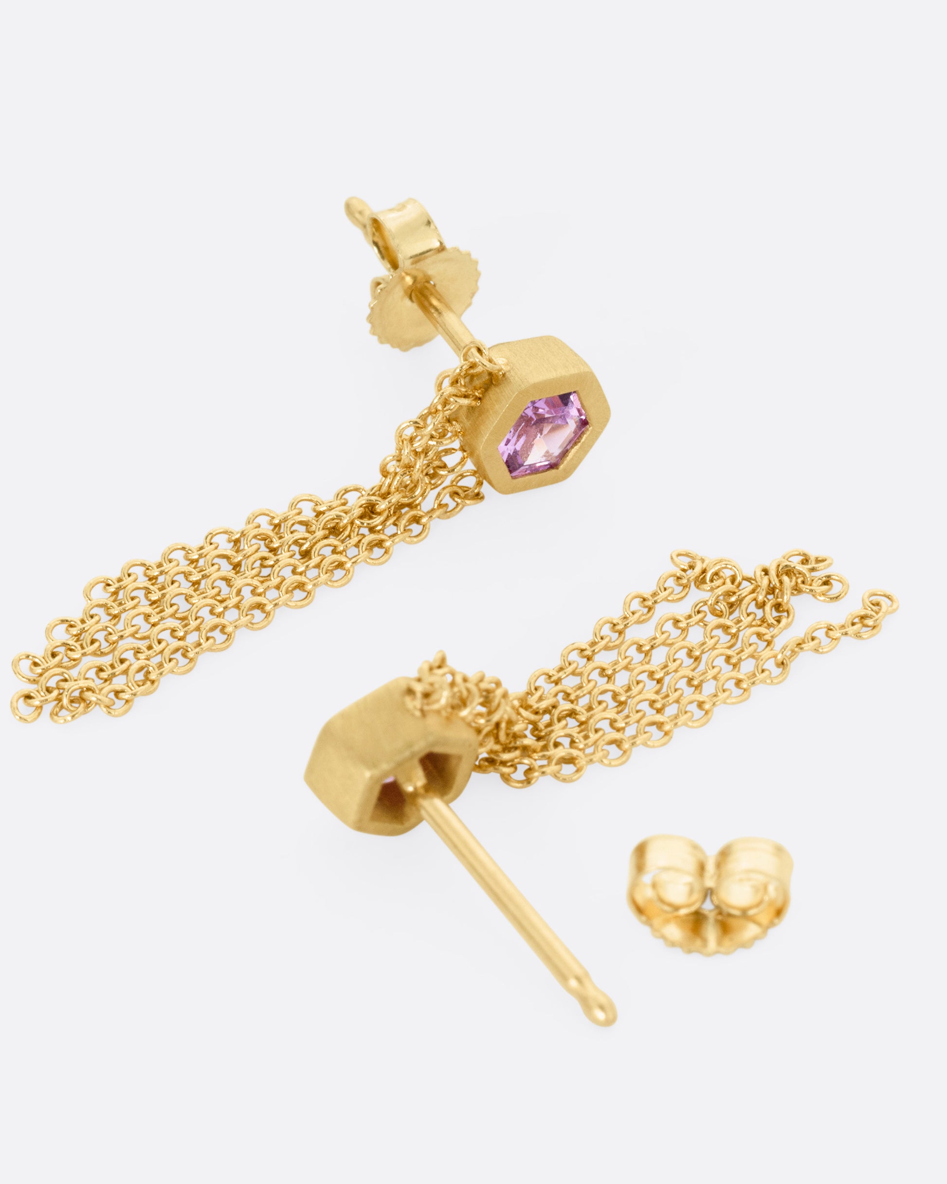 Cable chain fringe adds a bit of length and playful movement to this pair of hex shaped sapphire studs. One sapphire is pink, the other lavender, creating a subtle eye- catching look.
