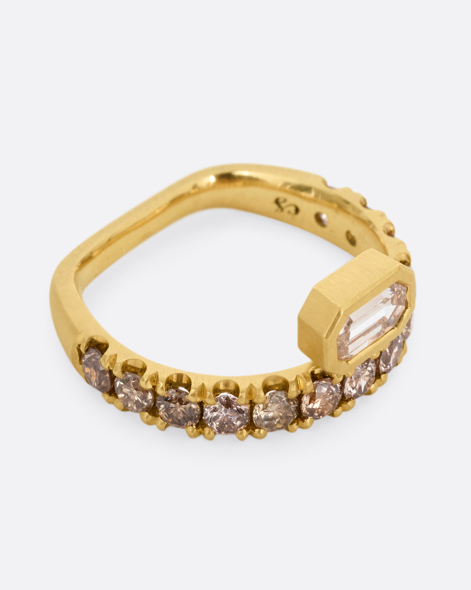 A single step cut champagne diamond rests atop this pavé halo, setting your stack aglow. A flat back makes for a comfortable fit on your finger.