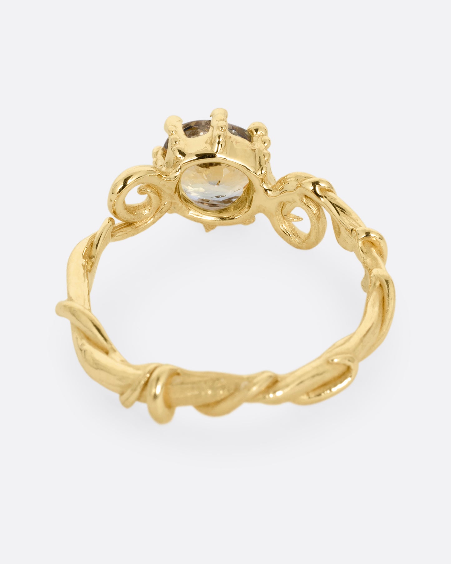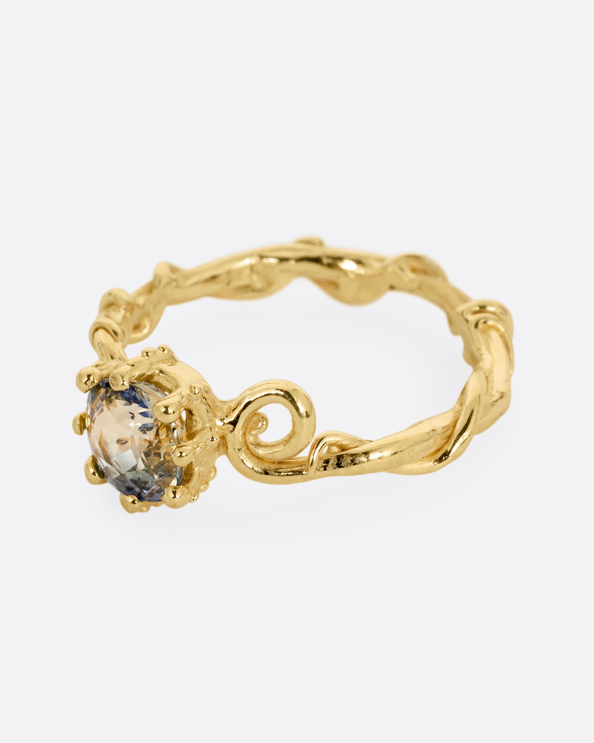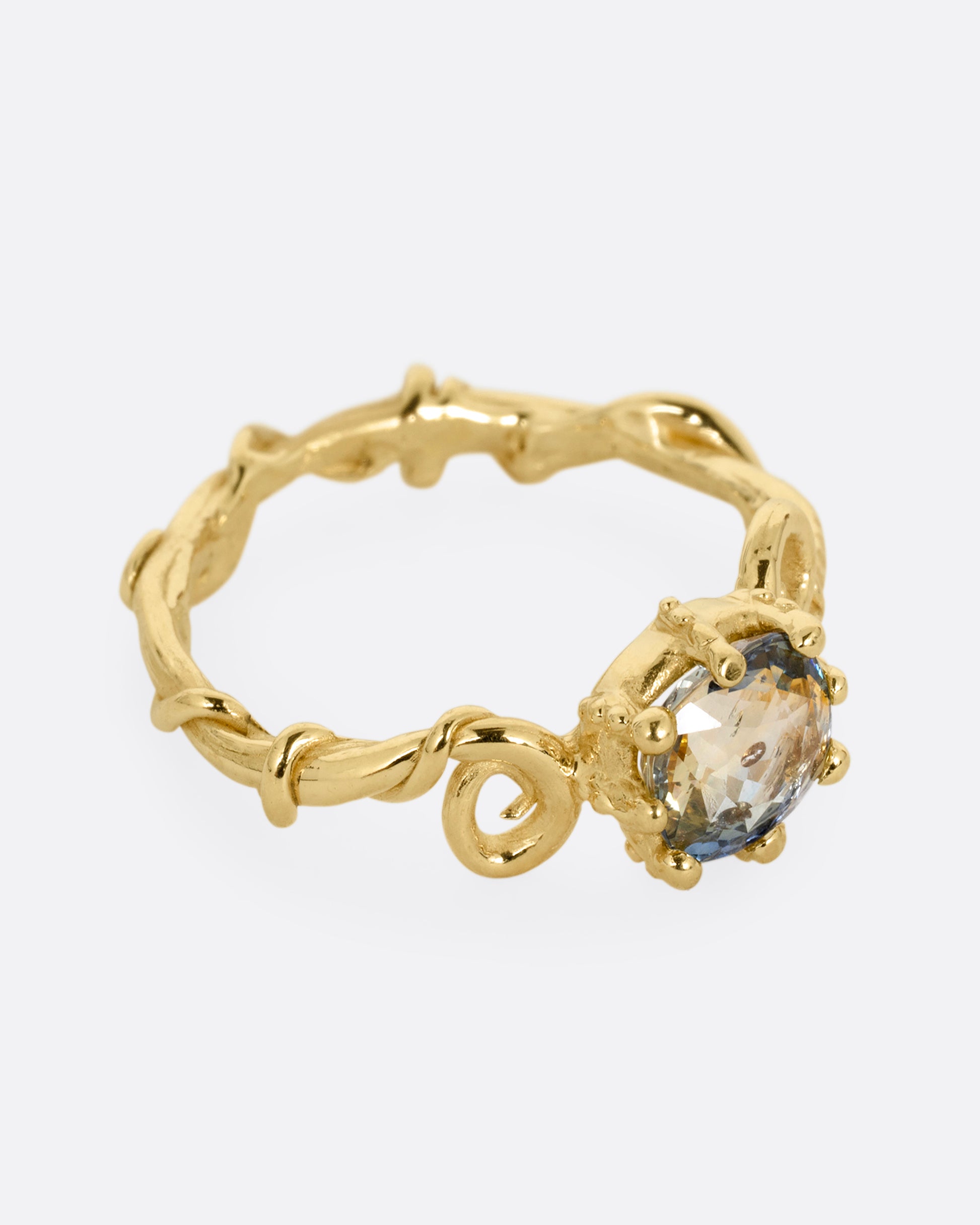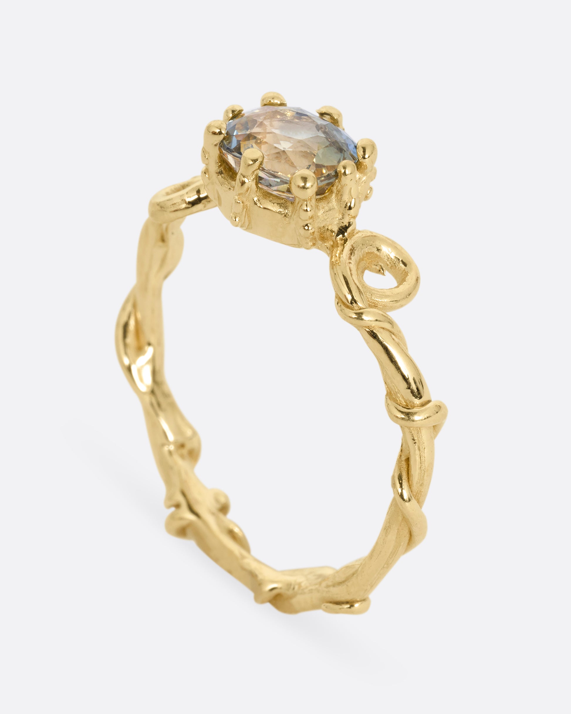 A striking bicolor sapphire sits at the heart of this twisty, dimensional band. Bicolor sapphires feature two contrasting shades within a single stone. An addition of texture and visual interest to your curated set up.