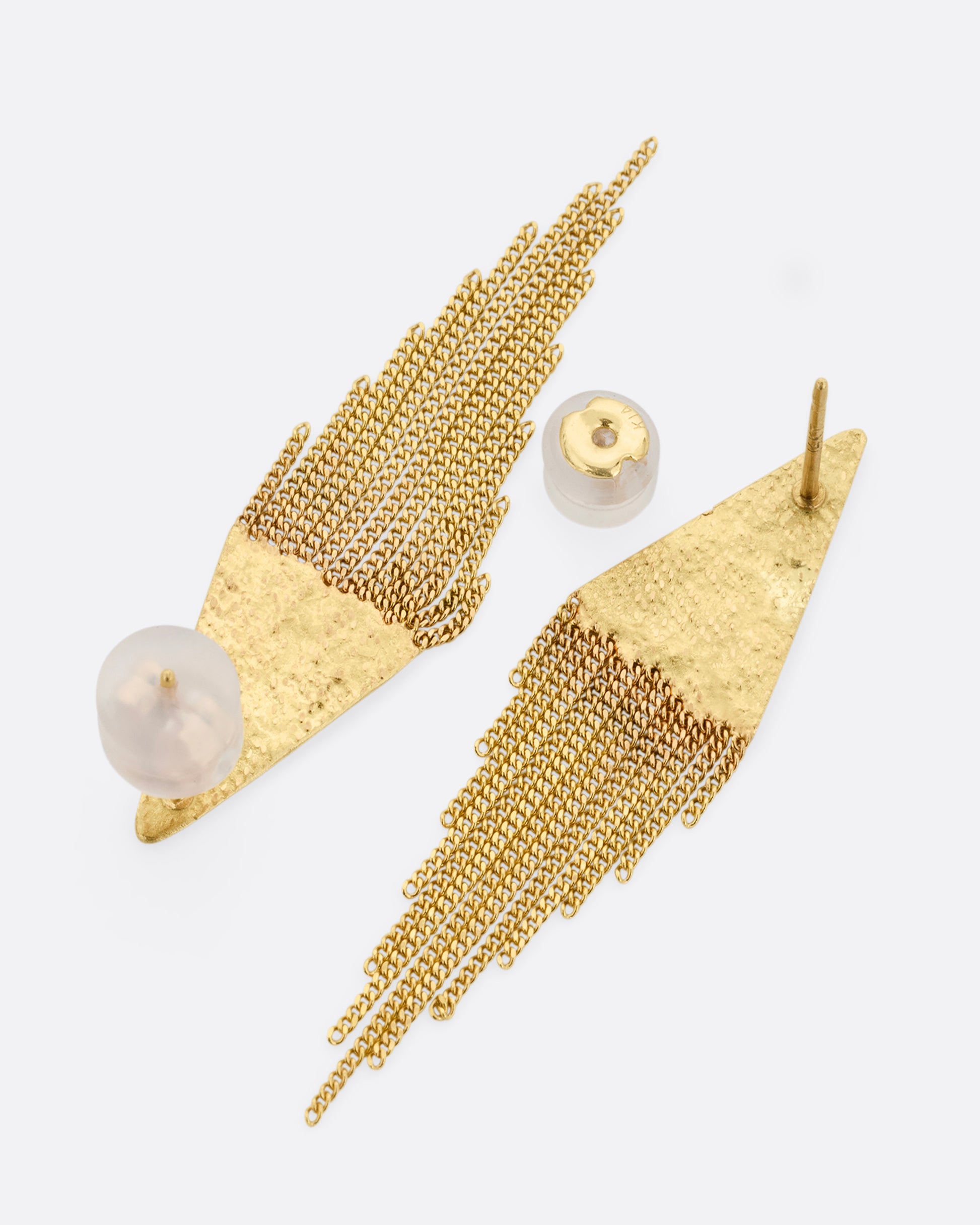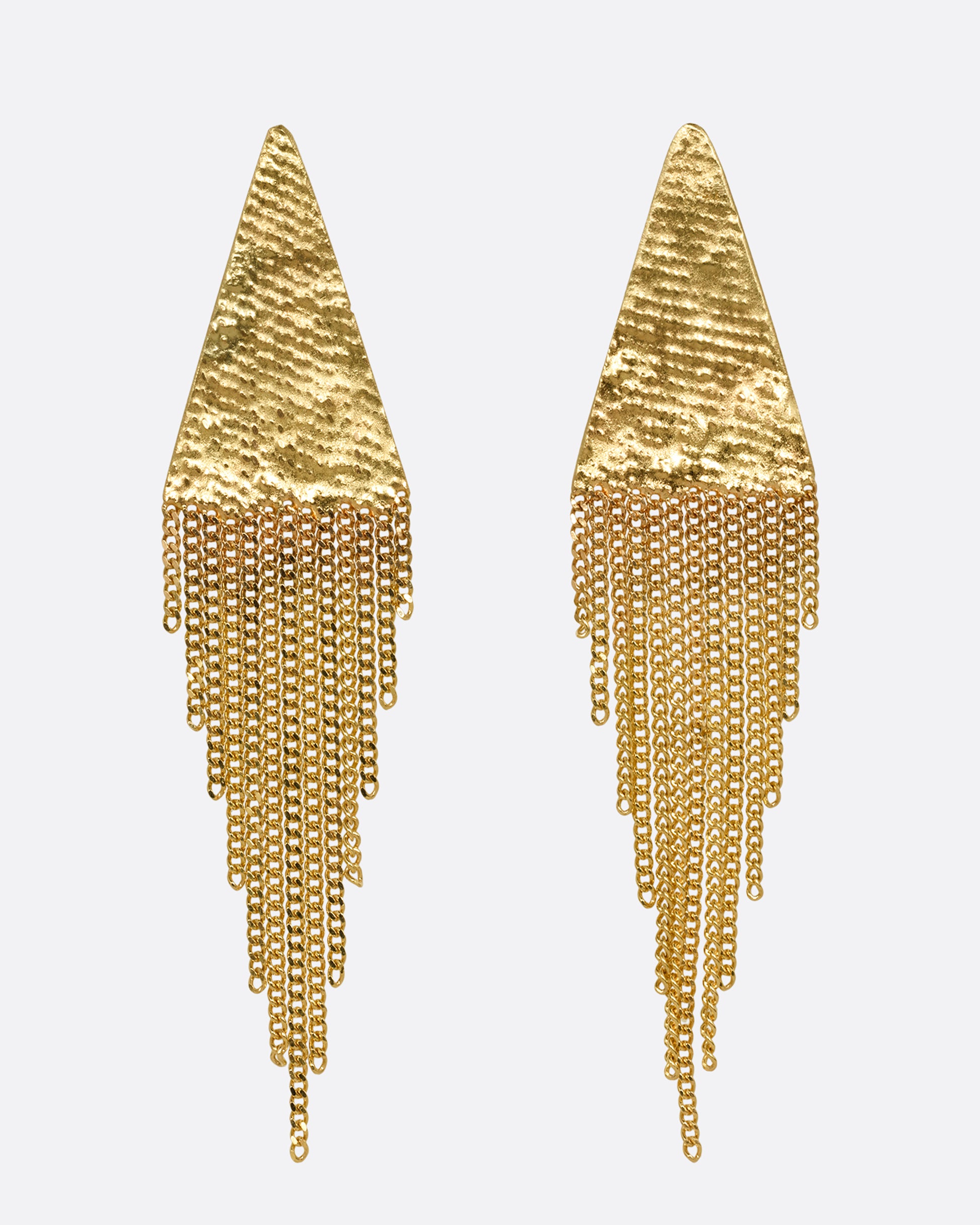 Yellow gold soldered triangle earrings with loose multi-strand chains.