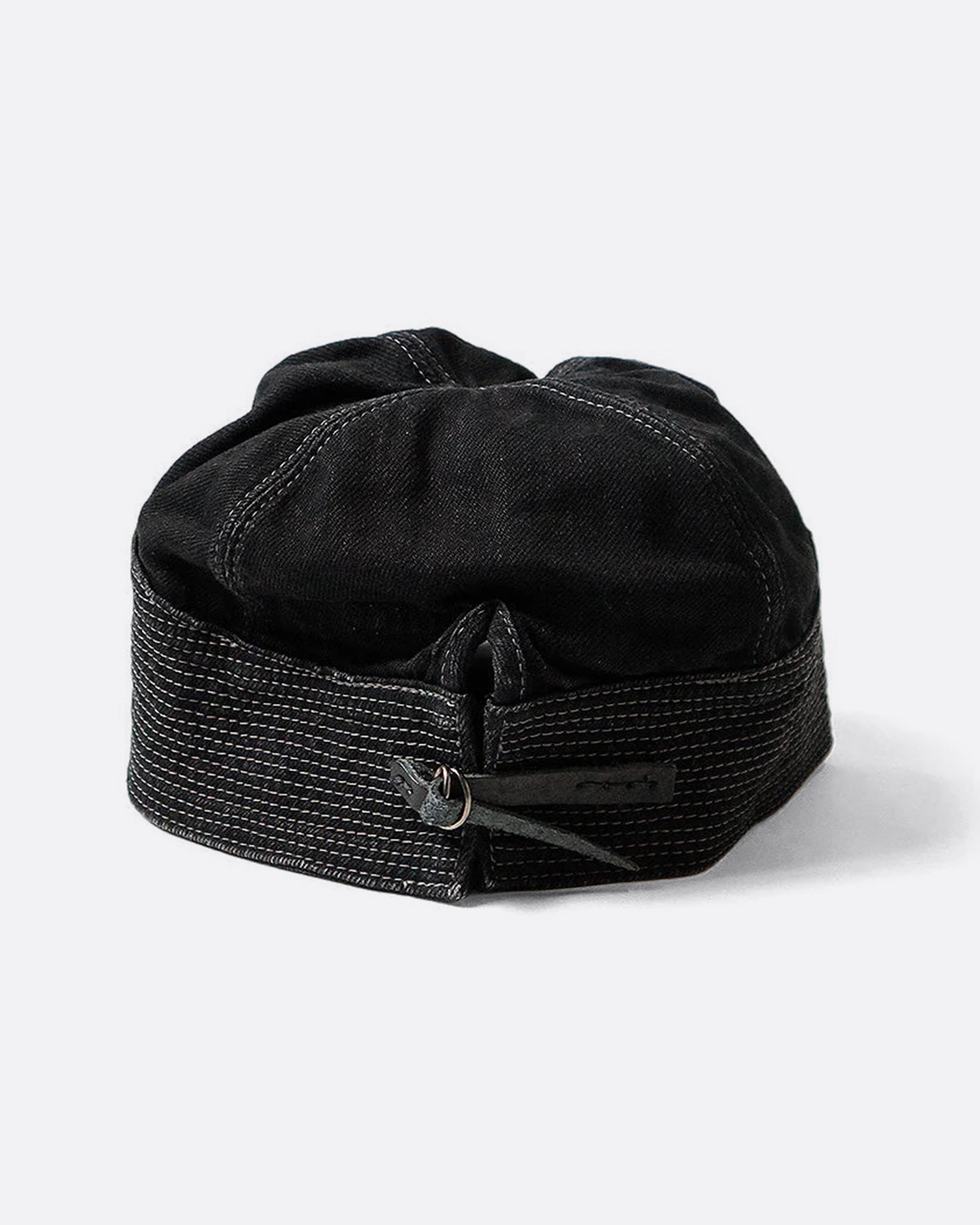 Acting as both adornment and reinforcement, rows of stitching line this black denim cap. A leather cinch at the back makes this cool piece adjustable.
