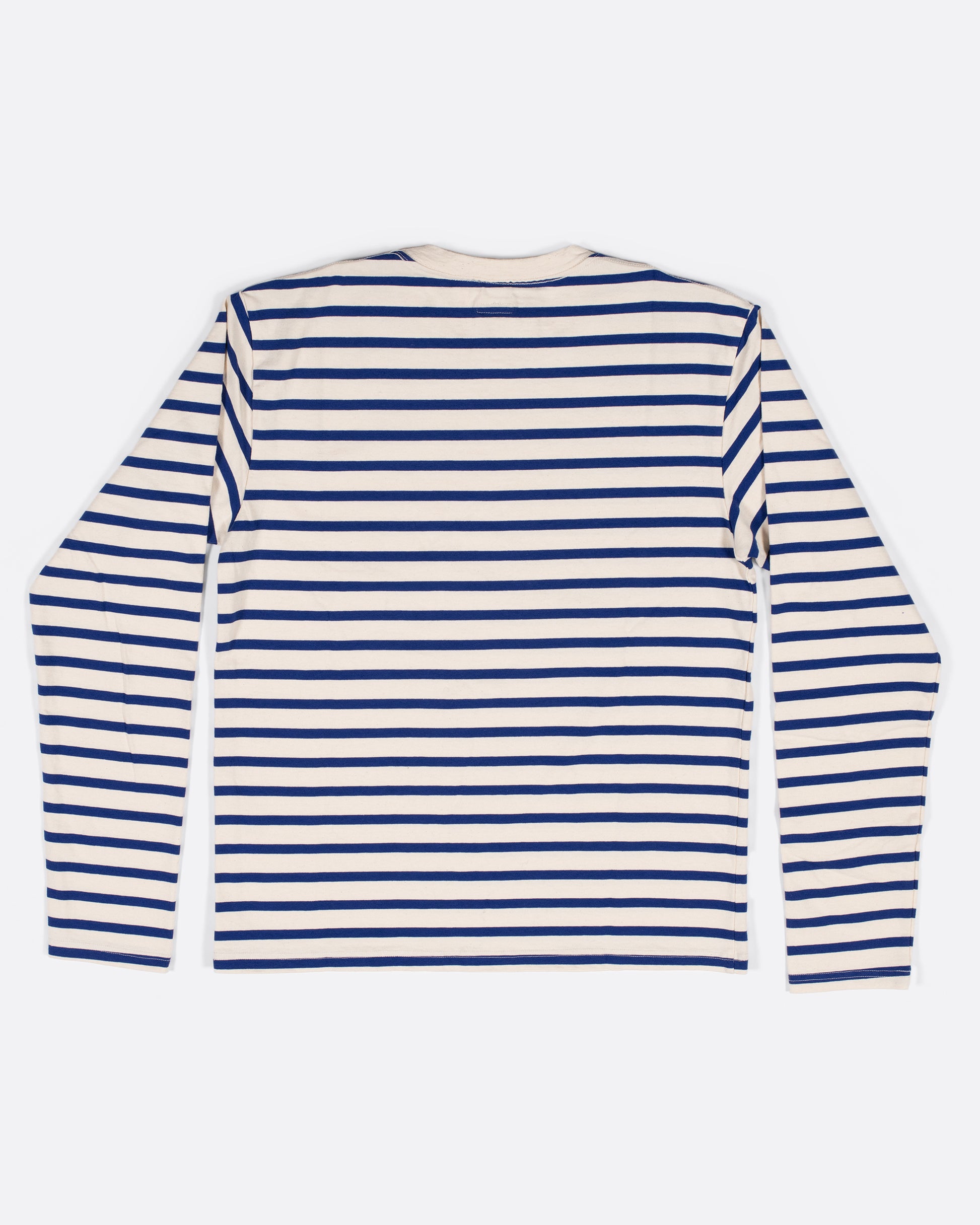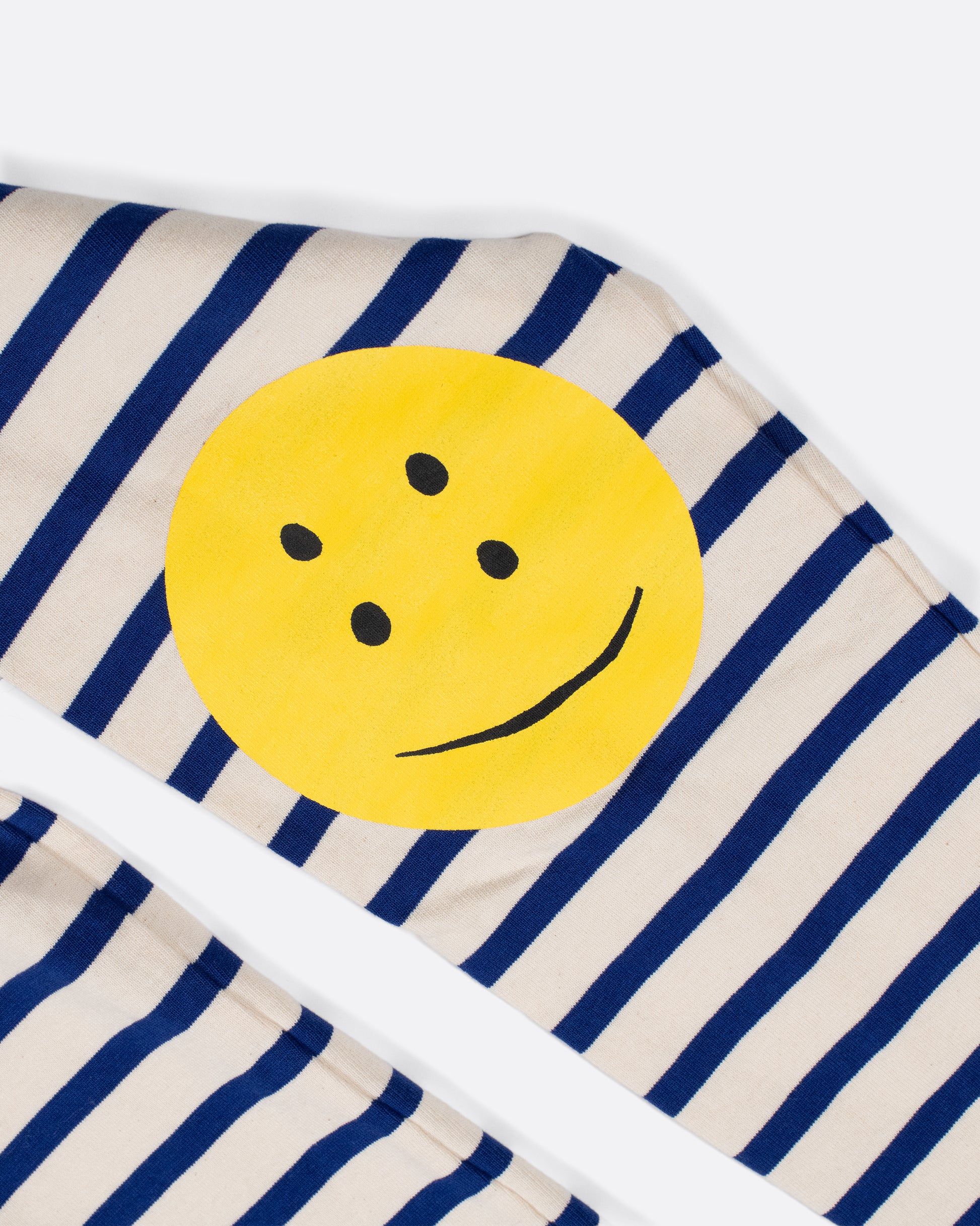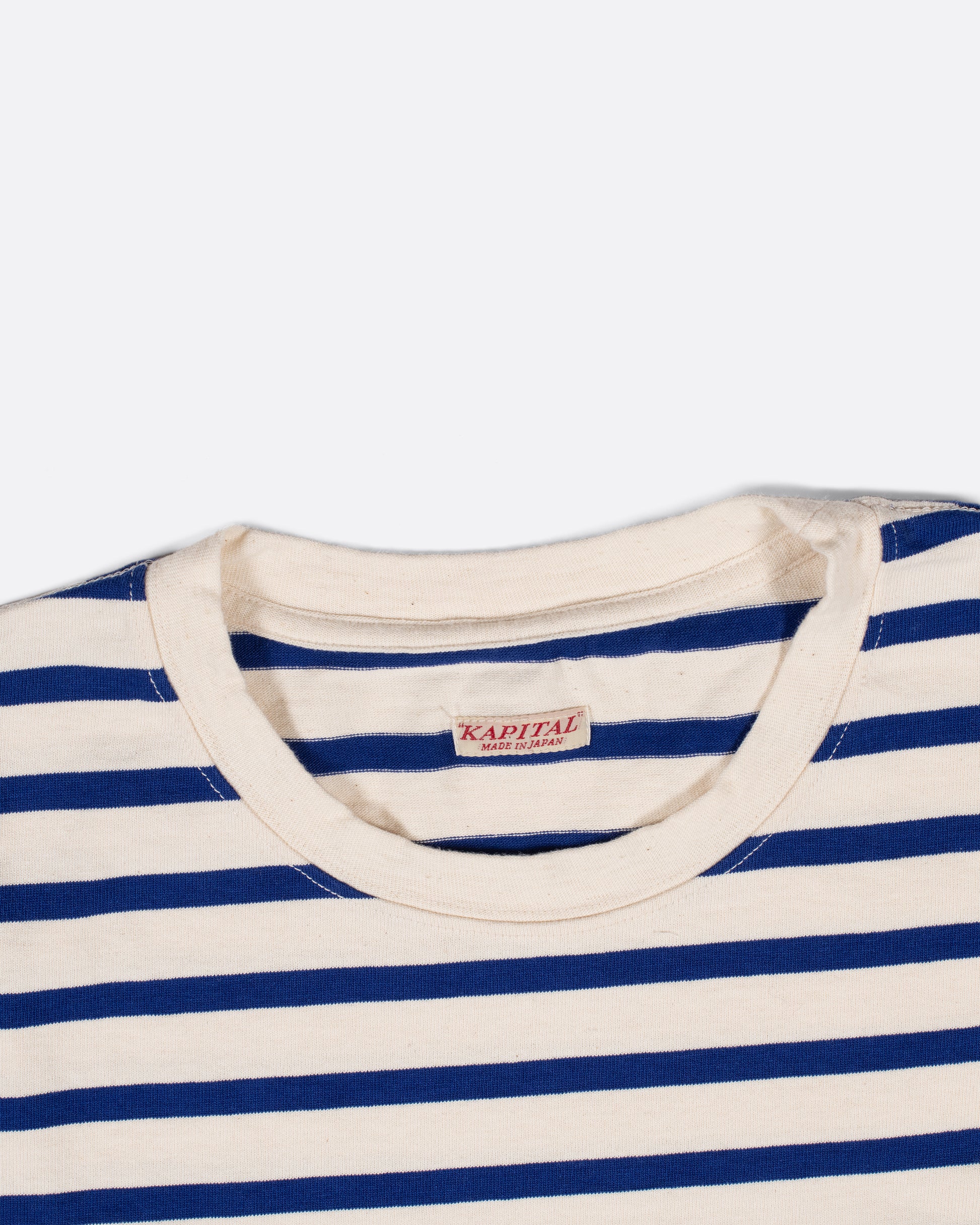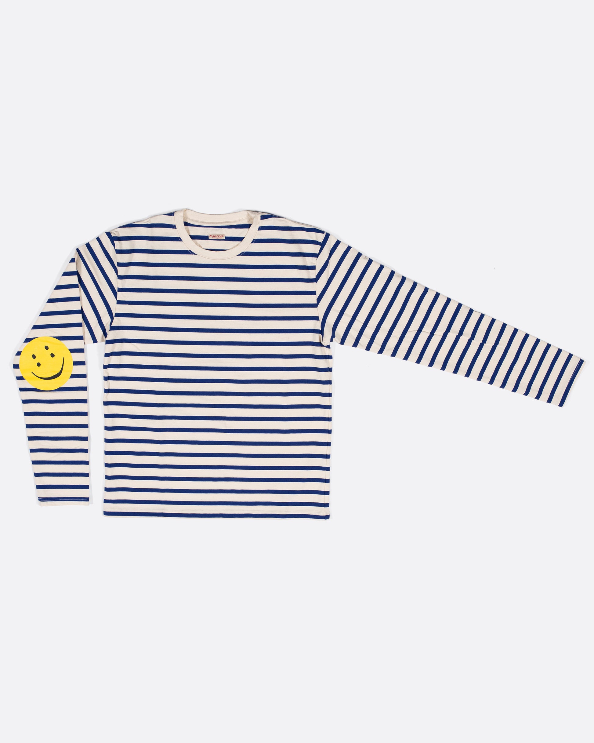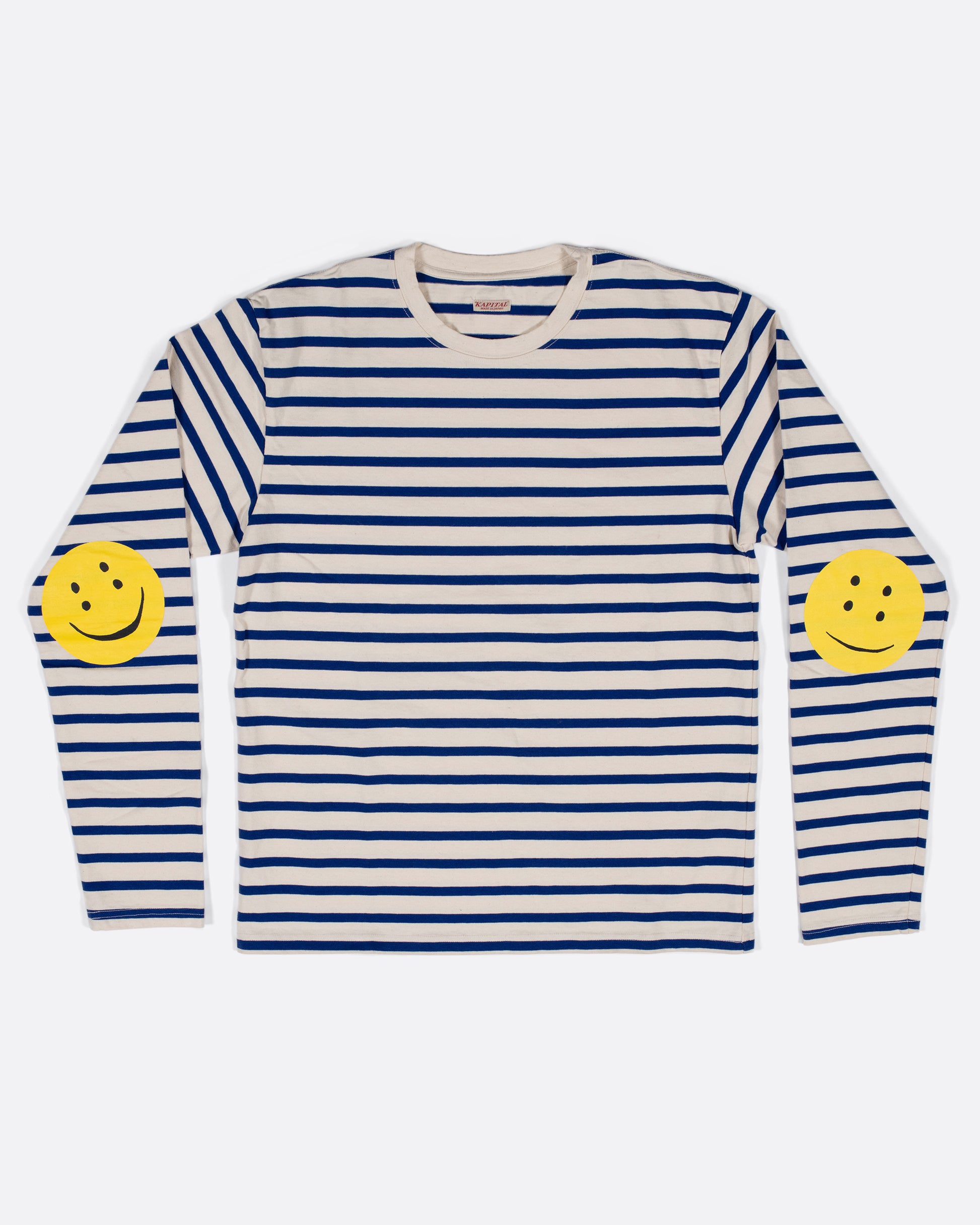 A blue and white striped, cotton, crewneck shirt with Kapital's fan favorite rainbow smiley elbow patches.