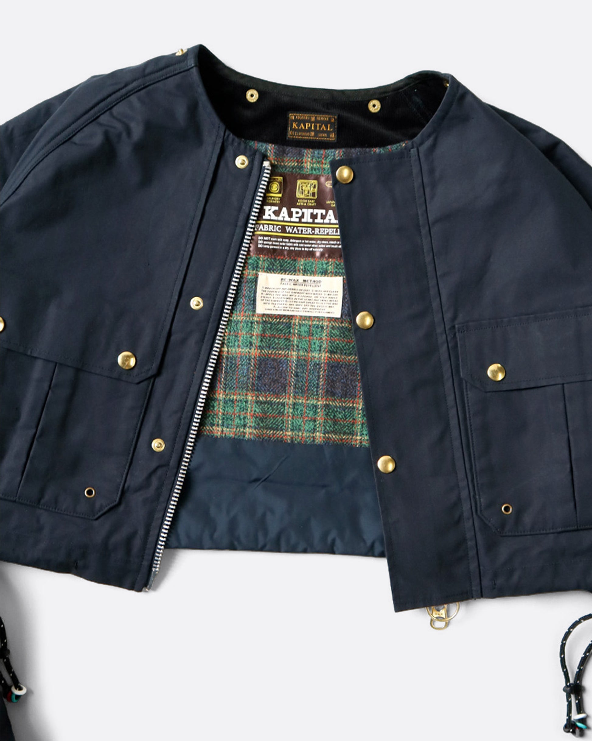 In oil coated high density cotton, this cropped jacket is both functional and chic. Ribbed cuffs keep away the cold, while a detachable hooded scarf allows for versatile styling.