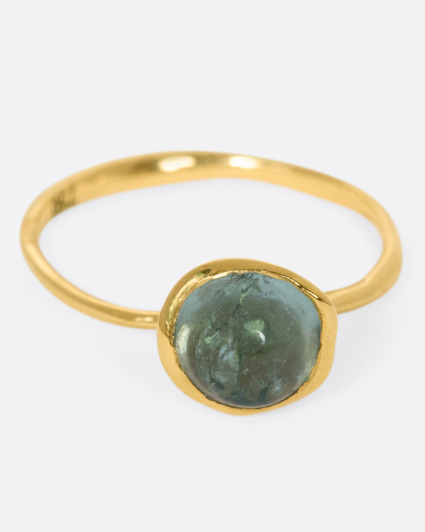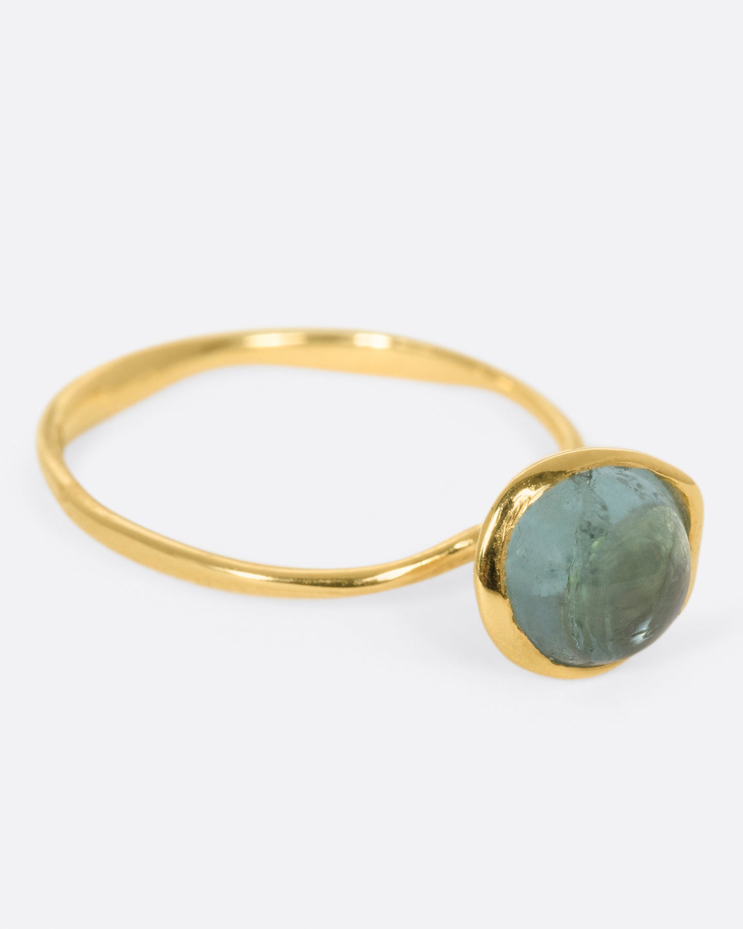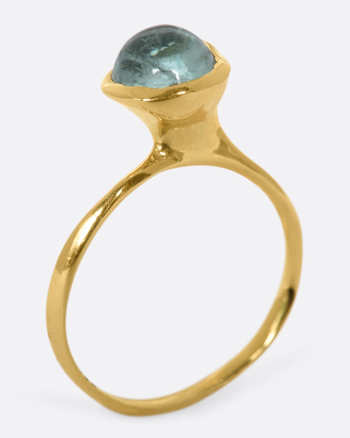 A wonky gold ring with a blue tourmaline cabochon set atop it.