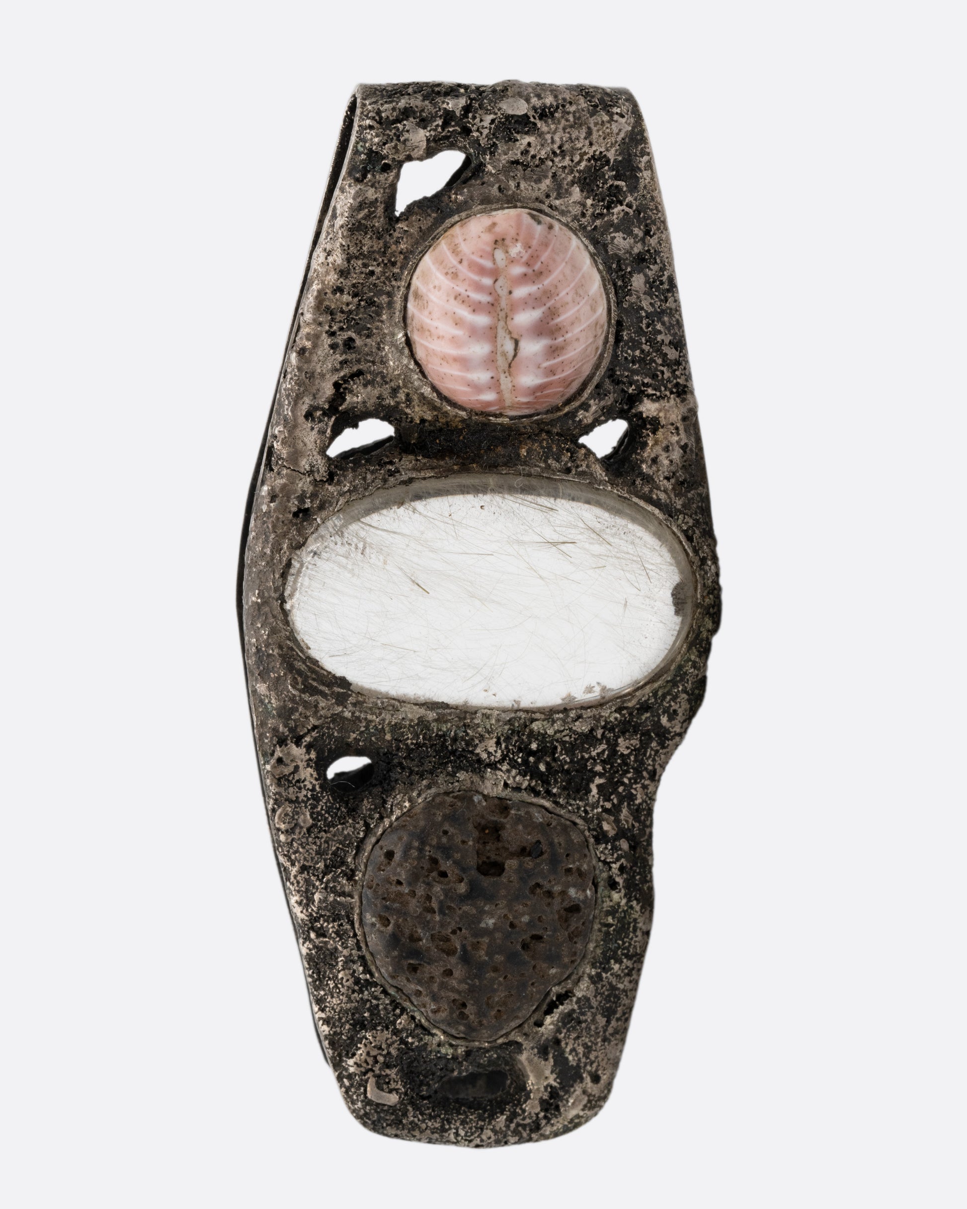 From the bench of Lou Zeldis, this weighty one- of- a- kind textural sterling money clip features an pebble, quartz, and seashell trio. Keep your cards and bills blessed.