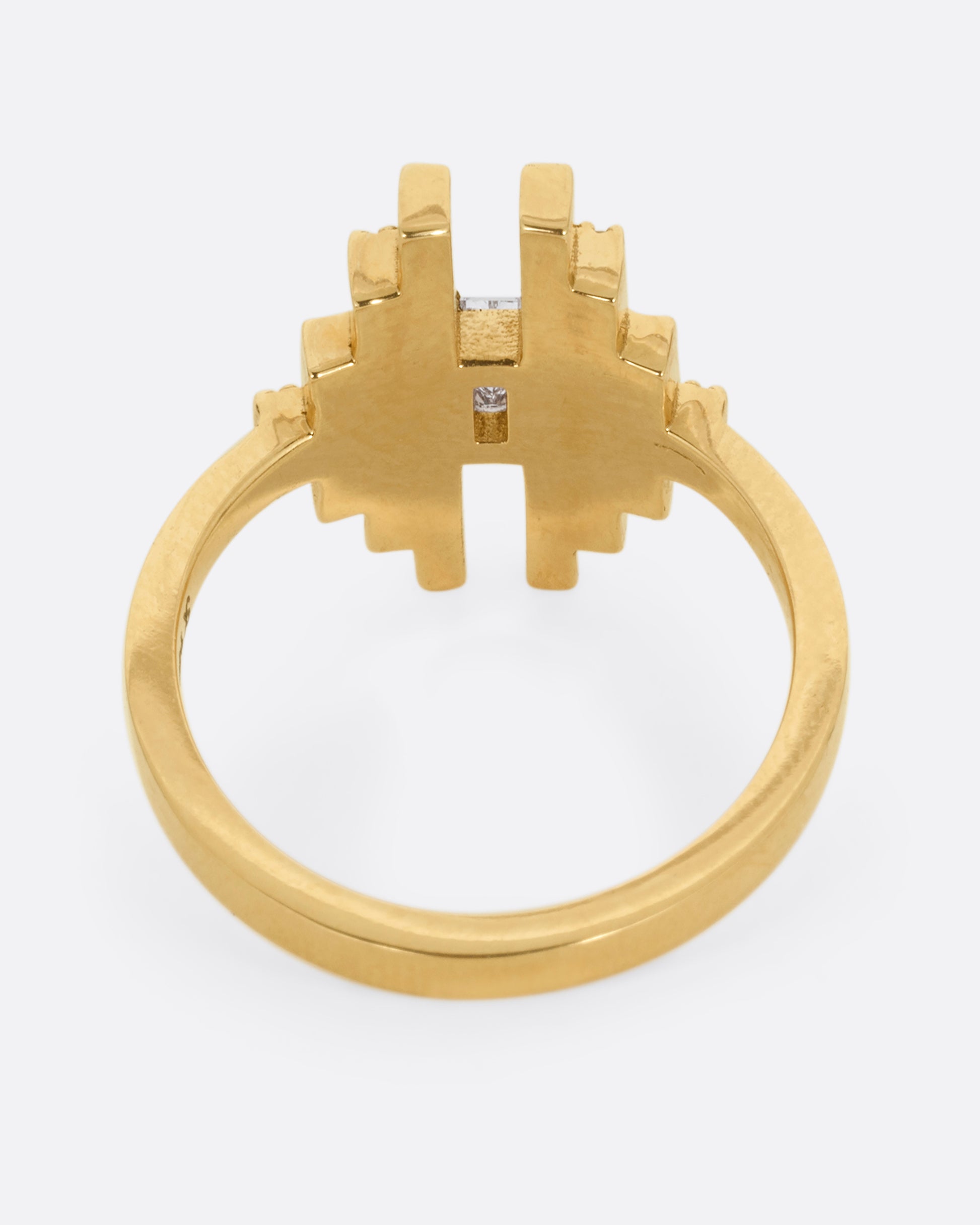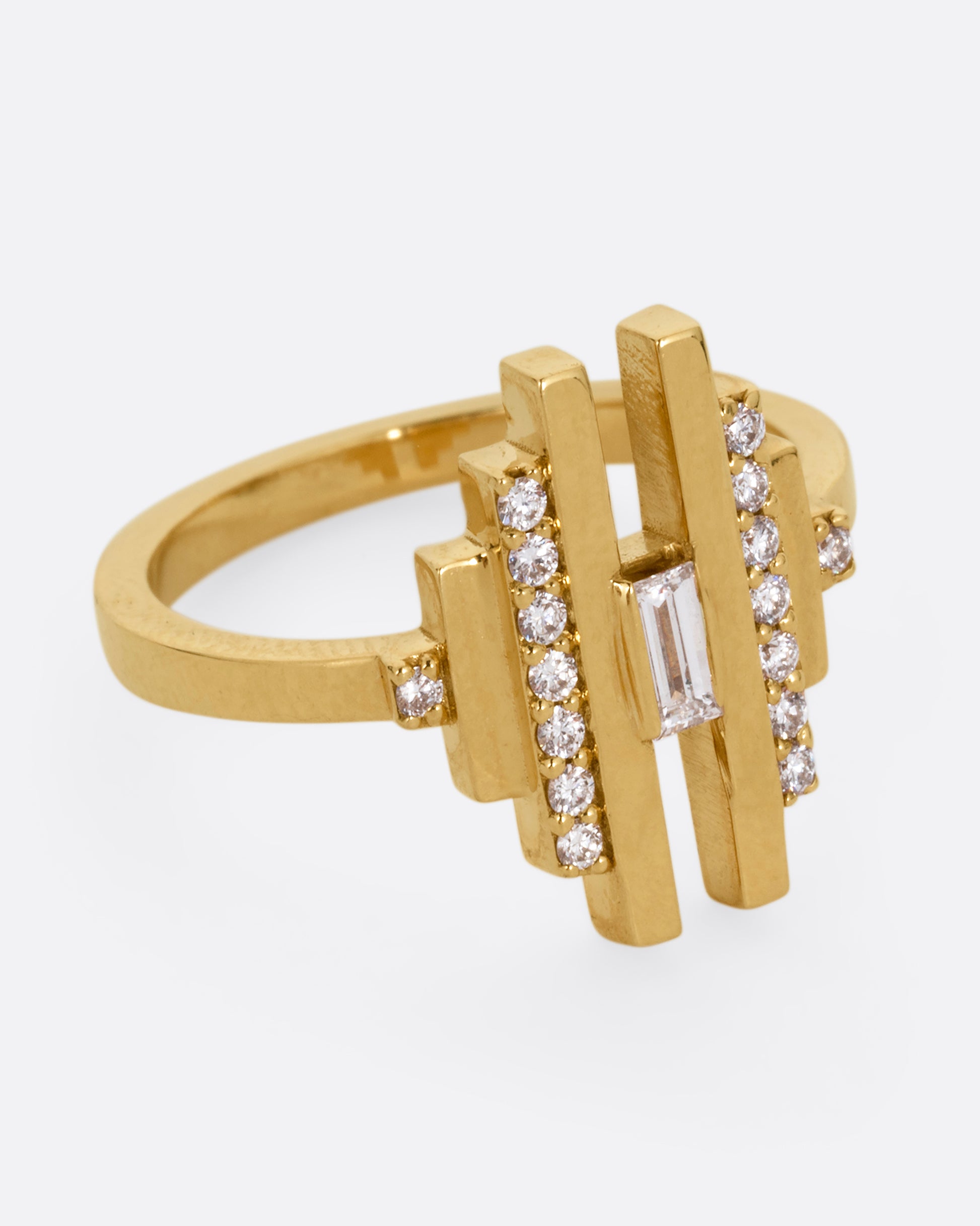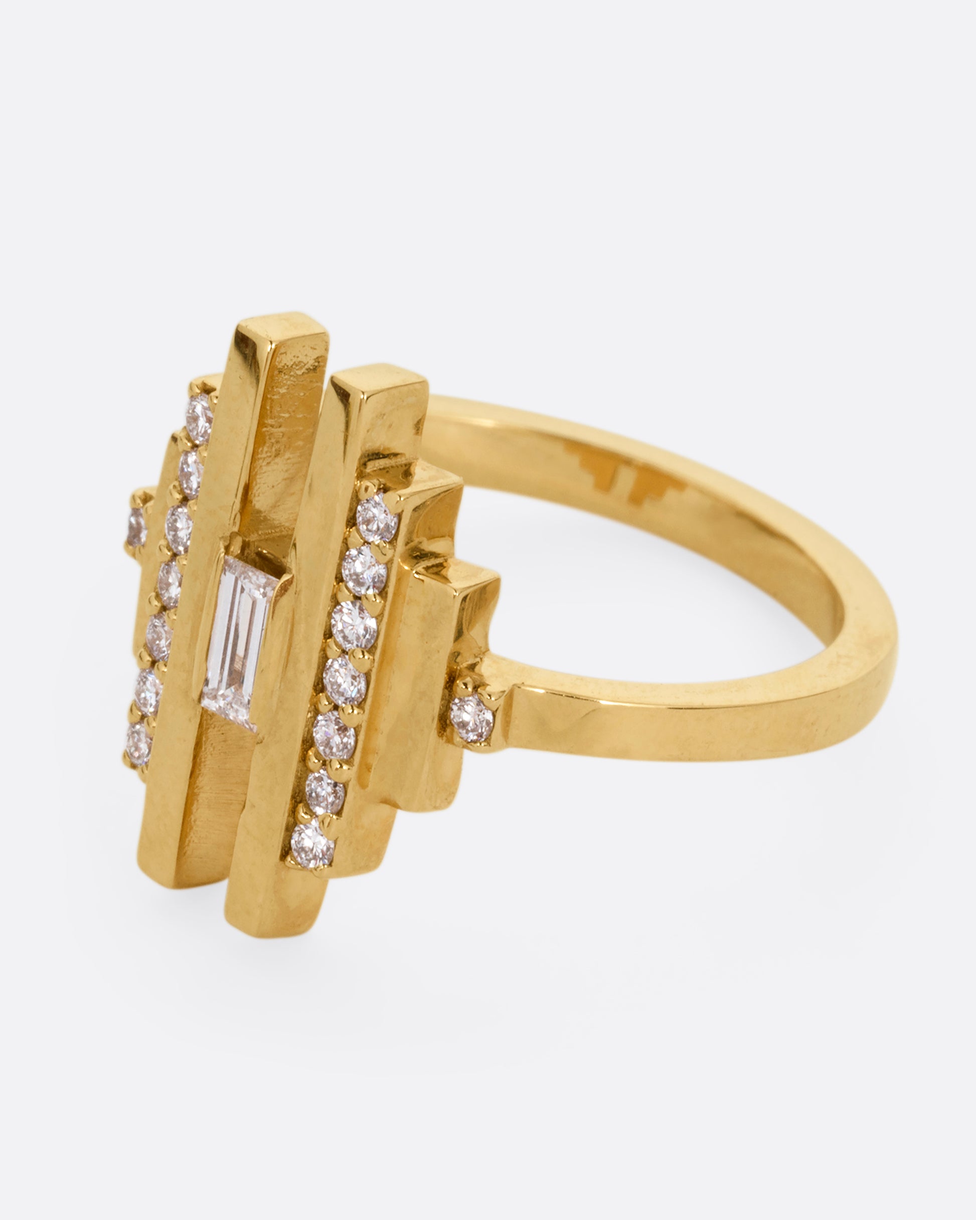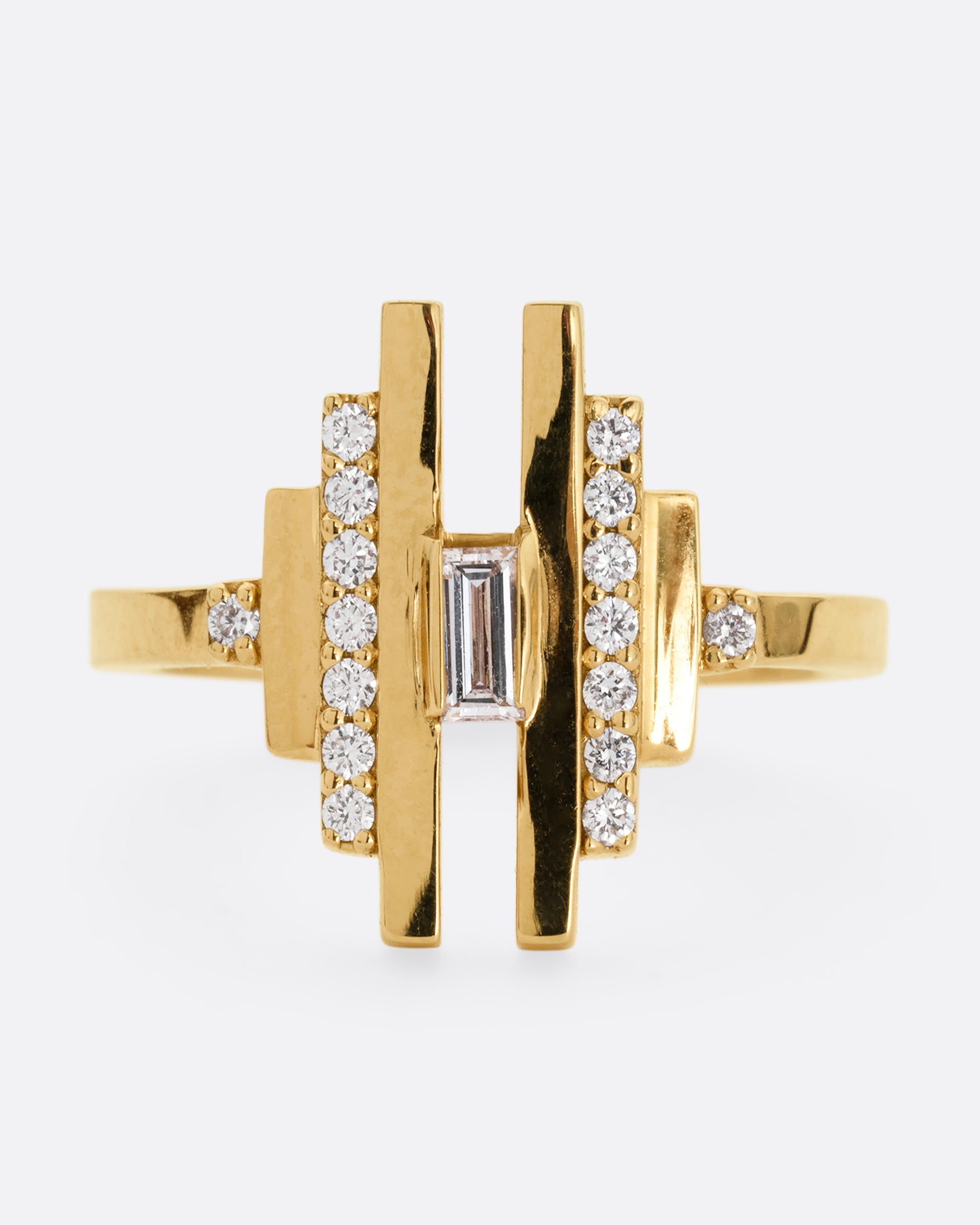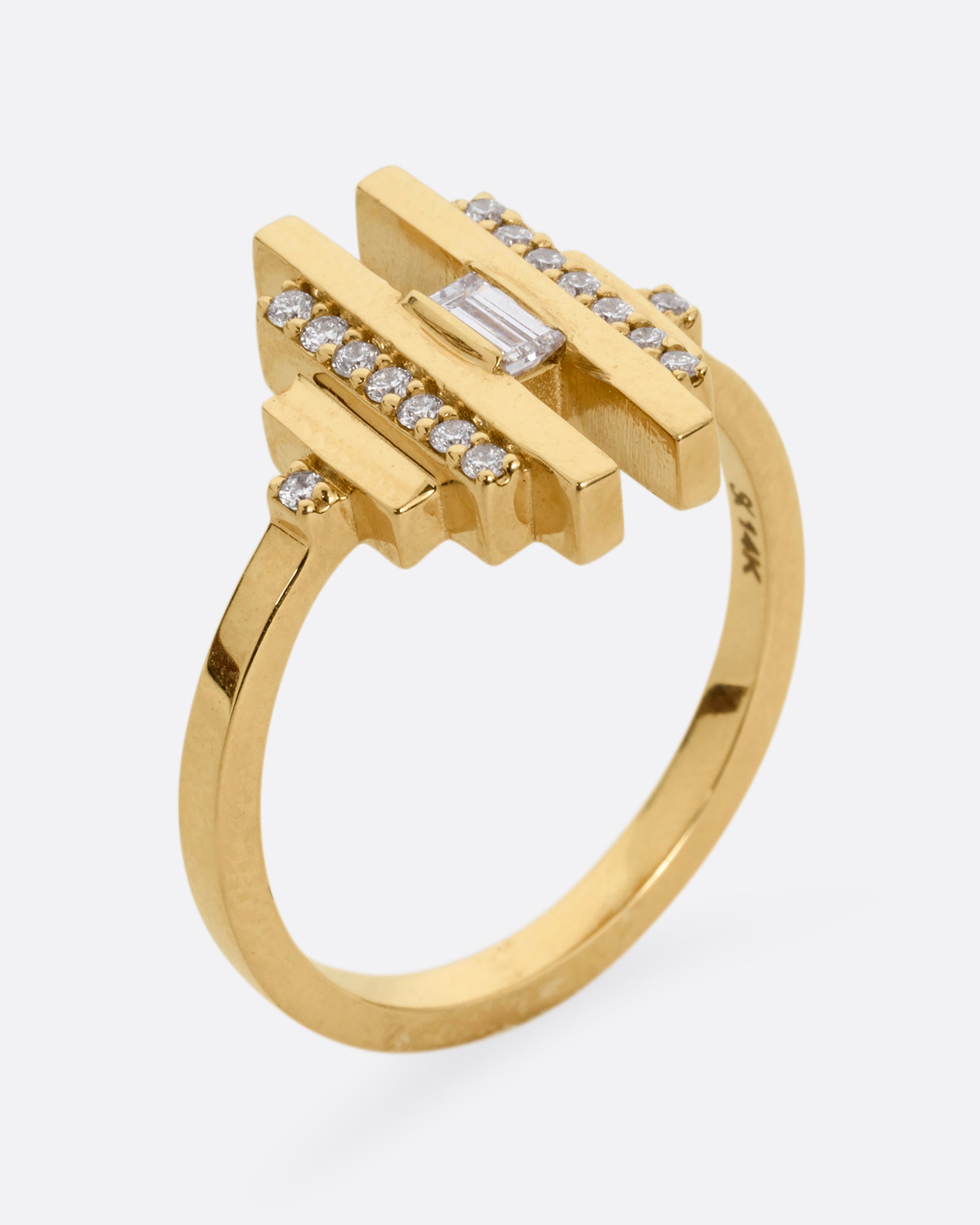 A nod to kilim motifs, this sleek geometric focal ring features graduated diamond steps bookending a central baguette diamond.