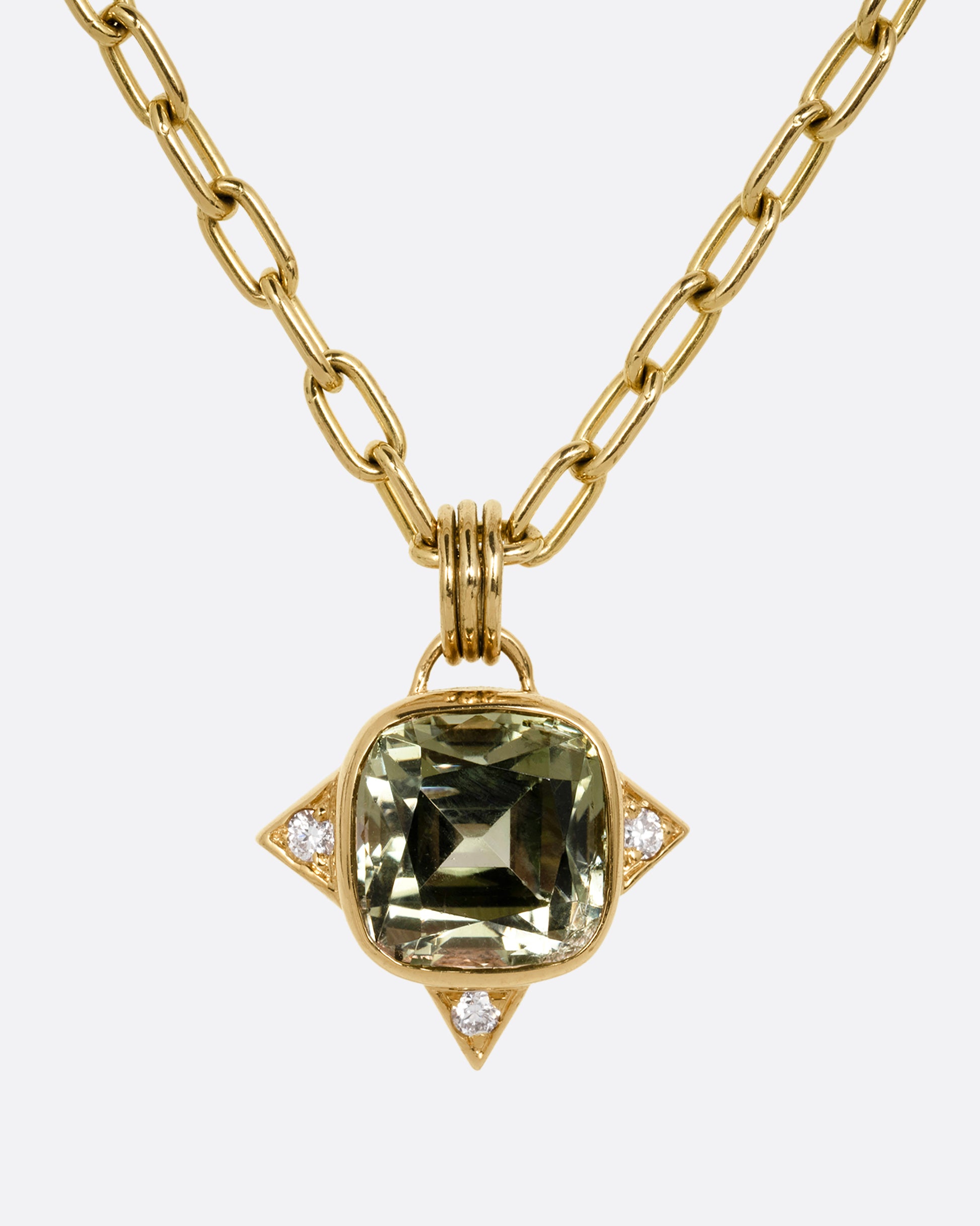 A lush green tourmaline glows from its setting among diamond studded points. Add a sharp bit of color and sparkle to your neckline with this substantial cable chain.