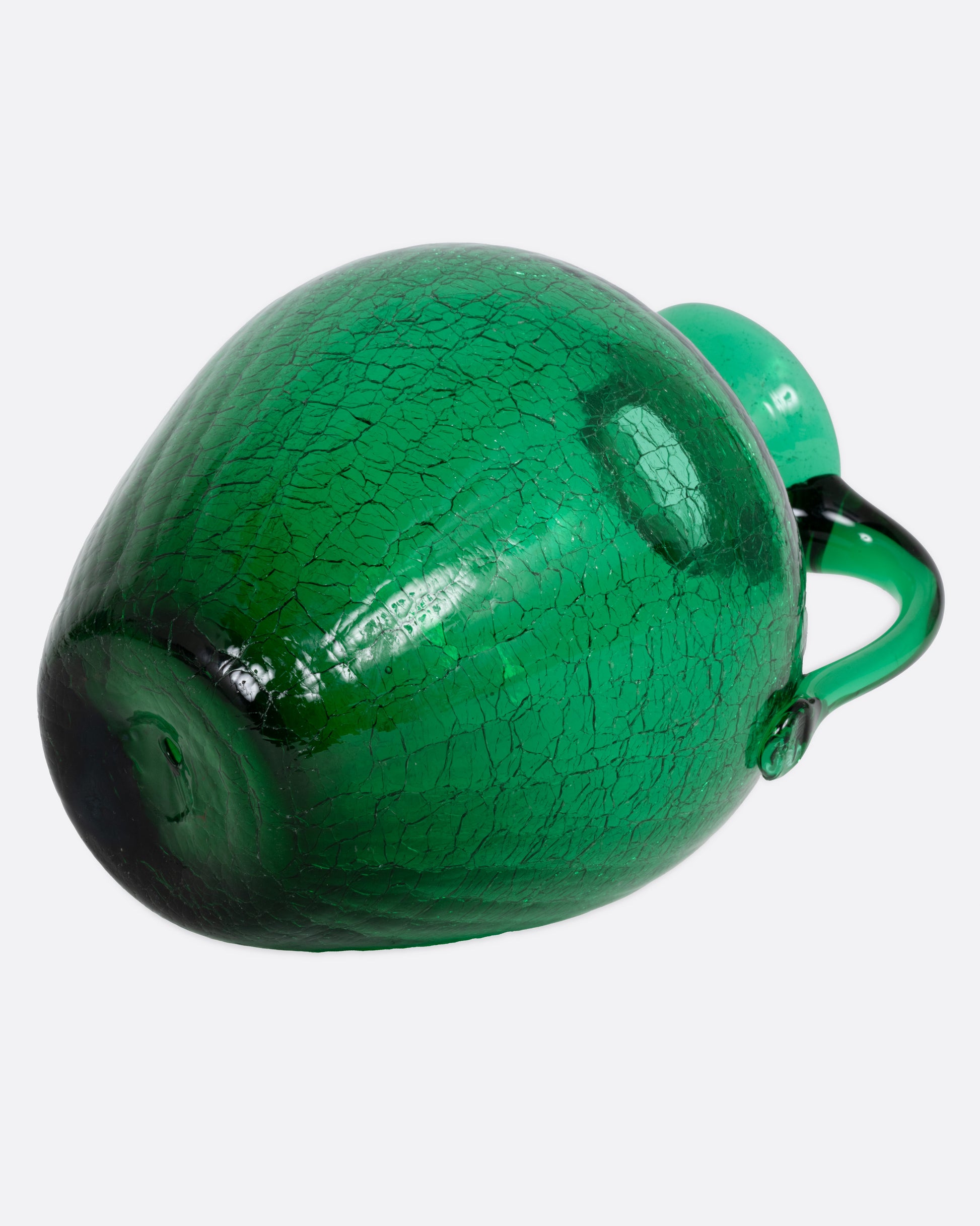 Place this lush green Kanawha crackle glass pitcher on your windowsill and let the sun set it aglow. Handcrafted in Dunbar, West Virginia, Kanawha Glass is known for their stunning midcentury modern designs. After being discontinued in 1989, Kanawha pieces have become covetable additions to any collection.