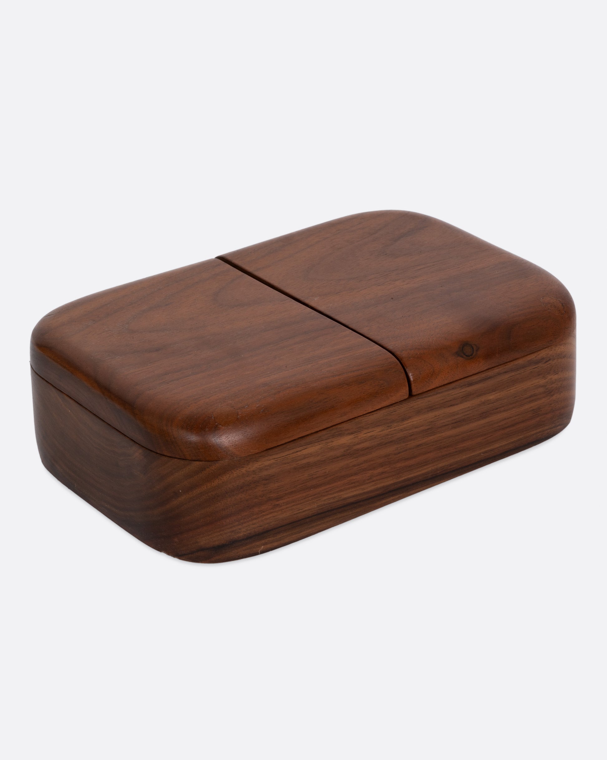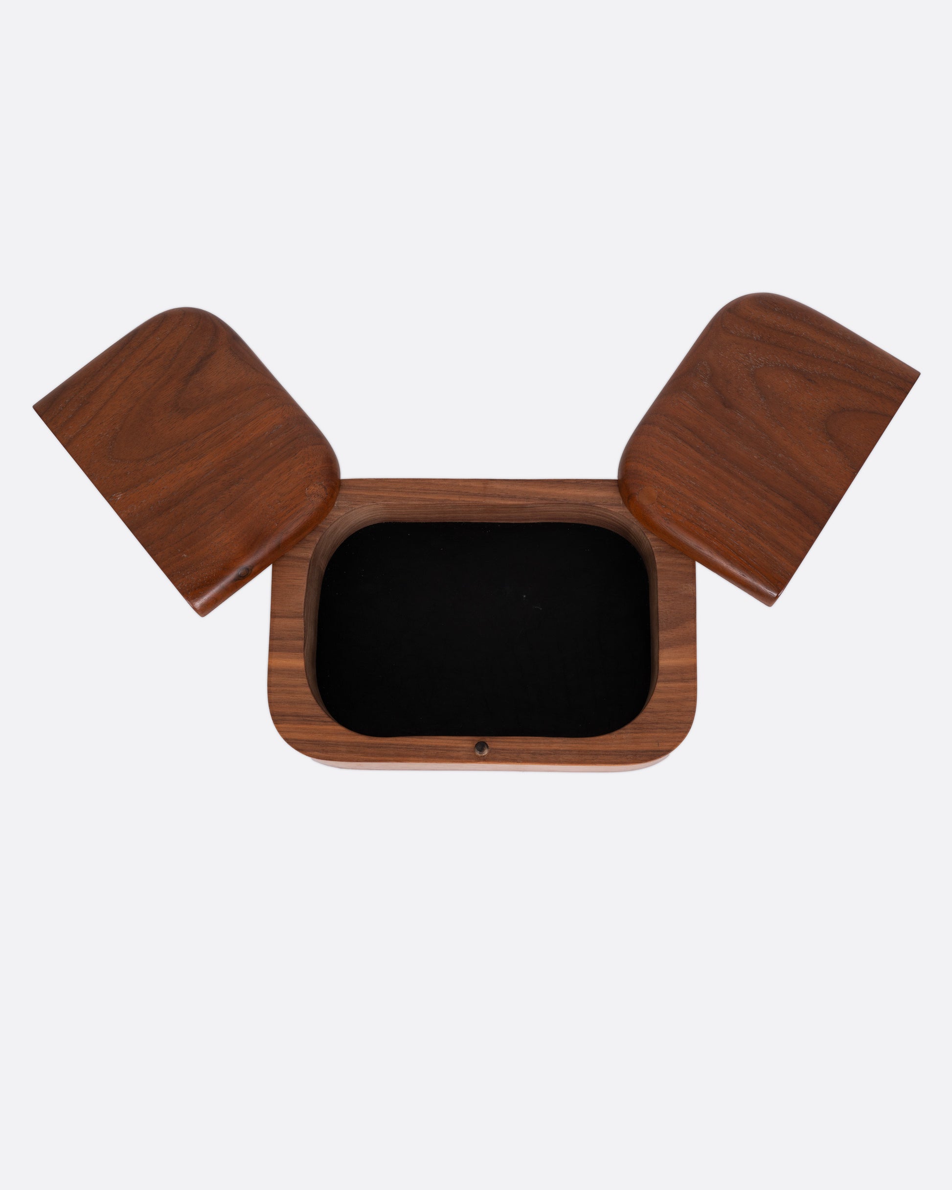 This sleek leather lined wooden box is a beautiful place to stow your daily jewelry. The cool swivel top allows for easy access.
